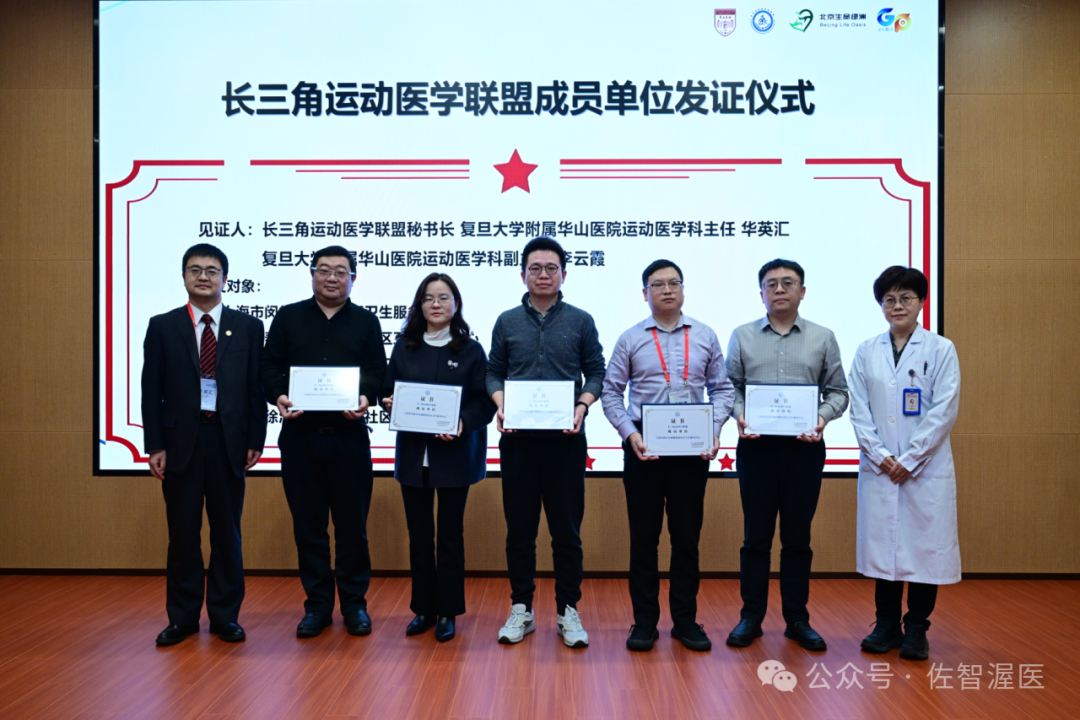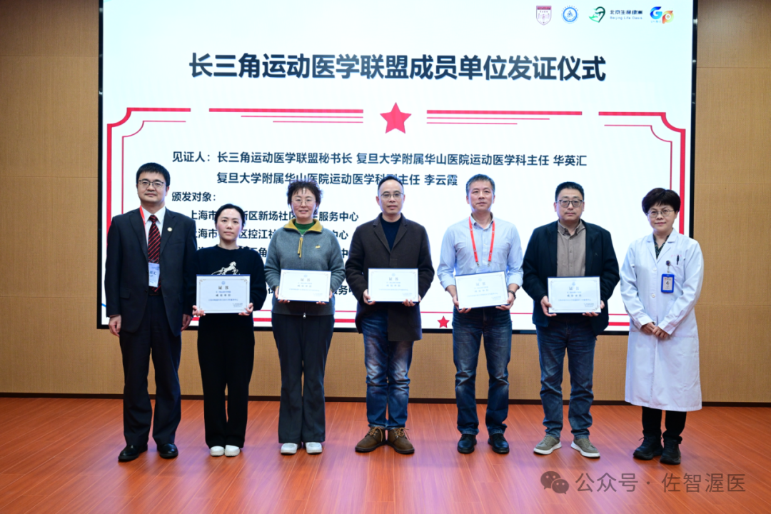 会议期间,长三角运动医学联盟举行正式成员单位授牌与新筹单位颁证仪式。长三角运动医学联盟秘书长、复旦大学附属华山医院运动医学科主任华英汇,复旦大学附属华山医院运动医学科康复主任李云霞参与见证。