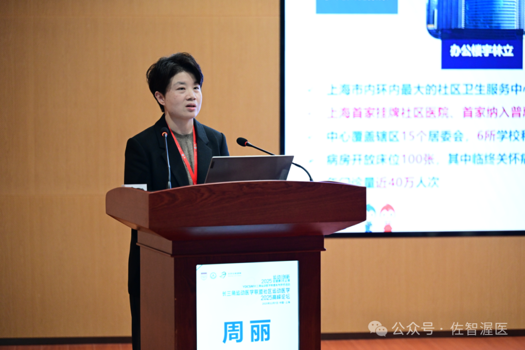 上海市黄浦区打浦桥街道社区卫生服务中心副主任周丽展示打浦桥社区的社区运动医学实践。作为上海首家挂牌社区医院,该中心构建 “三级 - 二级 - 中心 - 居家” 四级康复网络,以阶梯式人才培养机制打造专业团队,通过育才提质、用才增能,让学员从 “专业” 走向 “专家”、从学员成长为导师。