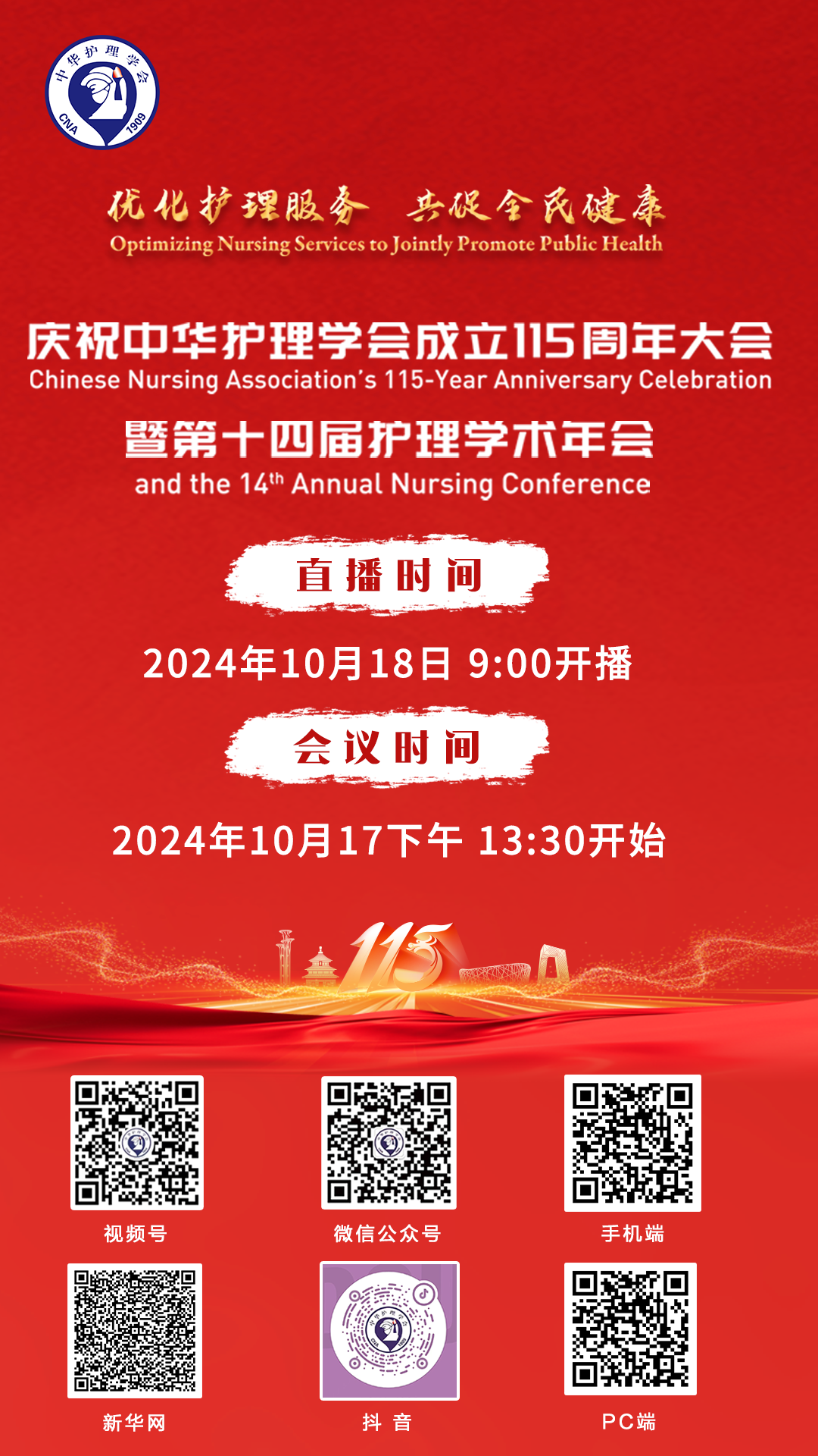 中华护理学会定于2024年10月17-18日在北京召开主题为“优化护理服务 共促全民健康”——庆祝中华护理学会成立115周年大会暨第十四届护理学术年会