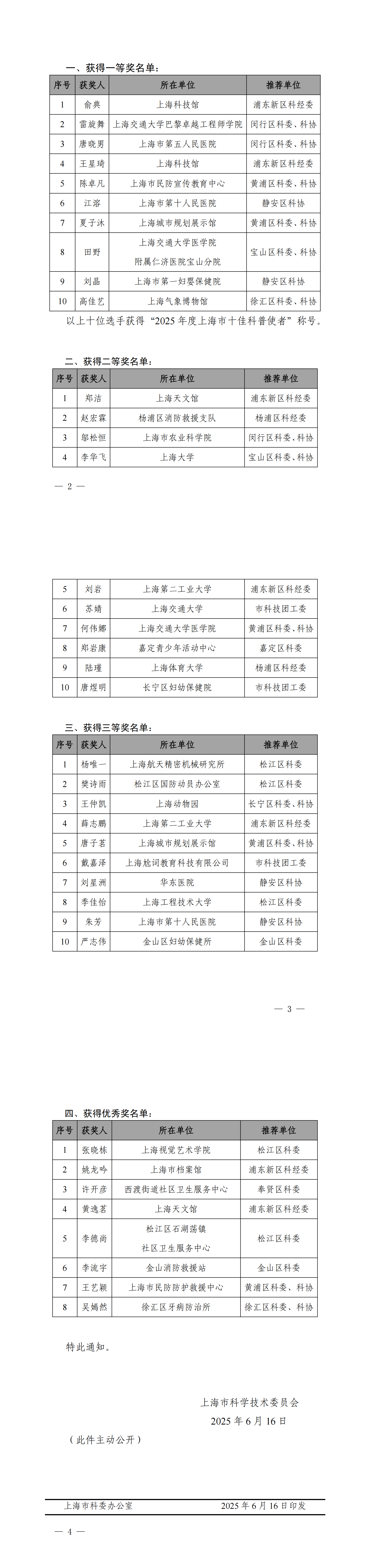 在各单位大力支持下,由上海市科学技术委员会主办的第十二届上海市科普讲解大赛圆满结束。经初赛、复赛、决赛,共产生一等奖10名、二等奖10名、三等奖10名、优秀奖8名,获得一等奖的选手将同时获得“2025年度上海市十佳科普使者”称号。现将获奖名单公布如下: