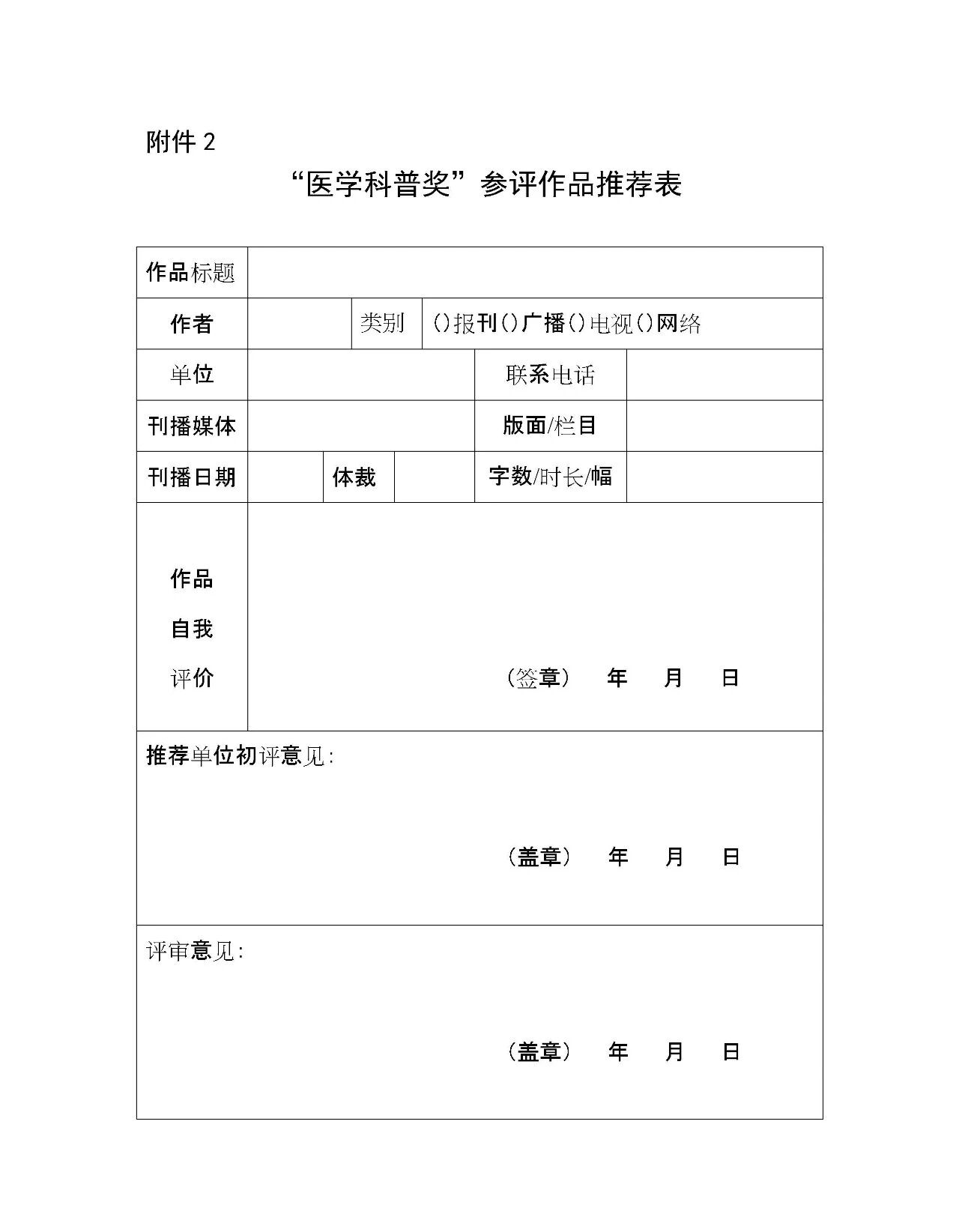 3.“医学科普奖”参选作品需填写参评表(见附件2),经单位审批盖章后于2024年2月8日前分别以Word格式(未盖章)、PDF格式(盖章)扫描报送至市健康促进中心媒体宣传部(联系人:李想,电话:54031290,邮箱:xuanchuanchu2@wsjkw.sh.gov.cn。请务必在所发邮件的邮箱主题内注明为“医学科普奖”)。
