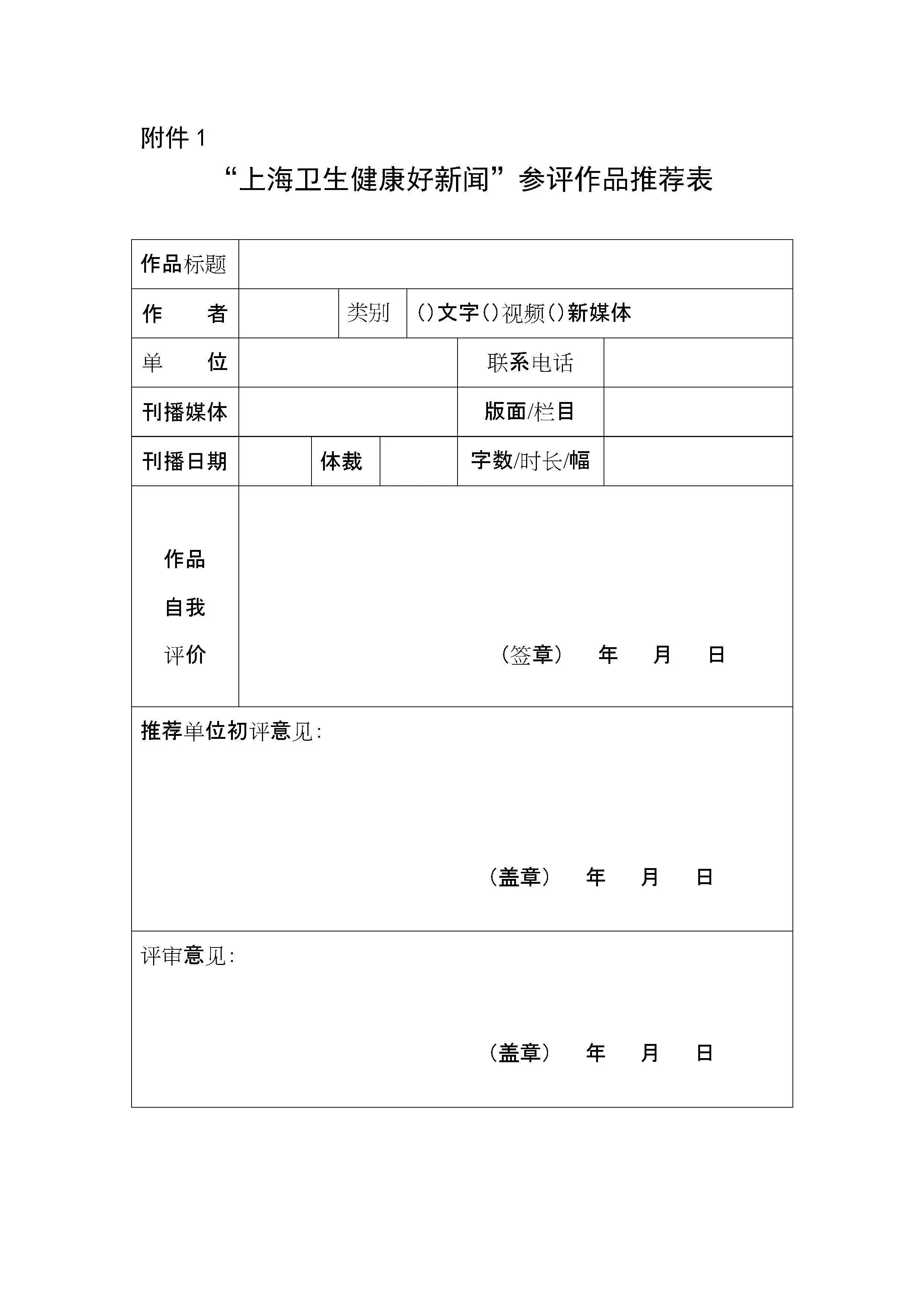 3.“上海卫生健康好新闻”参选作品需填写参评表(见附件1),经单位审批盖章后于2024年2月8日前分别以Word格式(未盖章)、PDF格式(盖章)扫描报送至市健康促进中心媒体宣传部(联系人:丁宜佳,电话:34198193,邮箱:xuanchuanchu2@wsjkw.sh.gov.cn。请务必在所发邮件的邮箱主题内注明为“好新闻”)。
