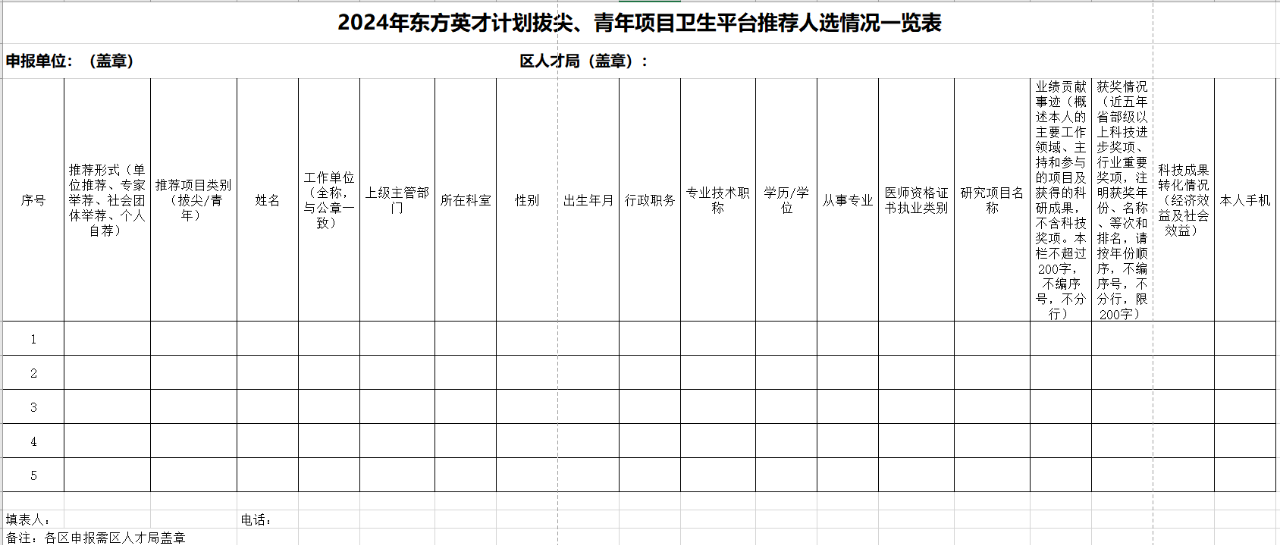 2.《2024年东方英才计划拔尖、青年项目卫生平台推荐人选情况一览表》(见附件)一份,加盖公章(各区盖区卫生健康委及区人才局公章),同时发送电子版(Excel格式)至邮箱kygl@shdrc.org。
