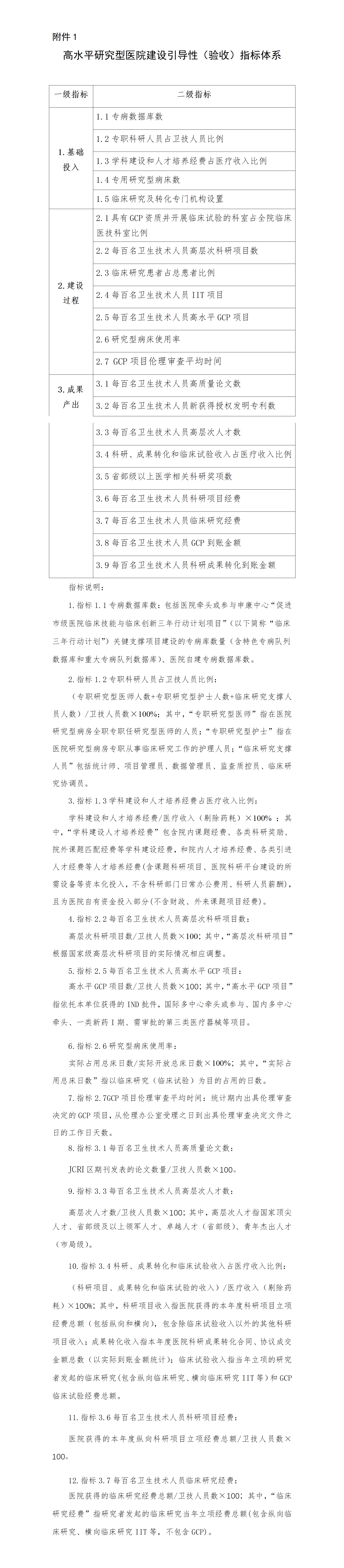 本次拟遴选高水平研究型医院试点建设单位、高水平研究型医院培育单位若干家,创建验收指标(即高水平研究型医院建设引导指标)见附件1。