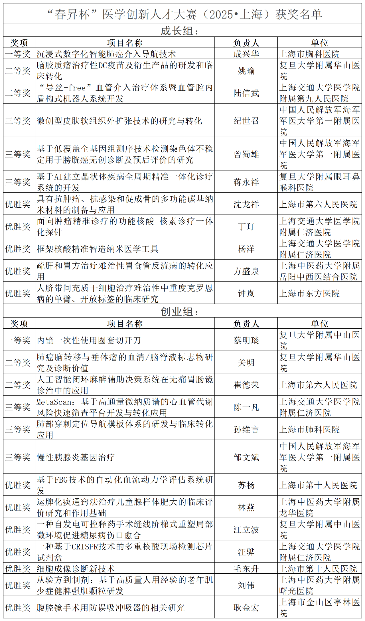 为进一步发现培养医学创新人才,激发本市医疗卫生机构科技成果转化动力,促进医学创新与产业资源深度融合,打造具有国际影响力的医学高地,在市委人才工作领导小组办公室指导下,市卫生健康委联合市科委、市经济信息化委、市知识产权局、市药品监管局共同举办了“春昇杯”医学创新人才大赛(2025•上海)。经初赛、复赛和决赛,“沉浸式数字化智能肺癌介入导航技术”等12个项目分别获一等奖、二等奖和三等奖,“具有抗肿瘤、抗感染和促成骨的多功能碳基纳米材料的制备与应用”等12个项目获优胜奖(名单见附件)。
