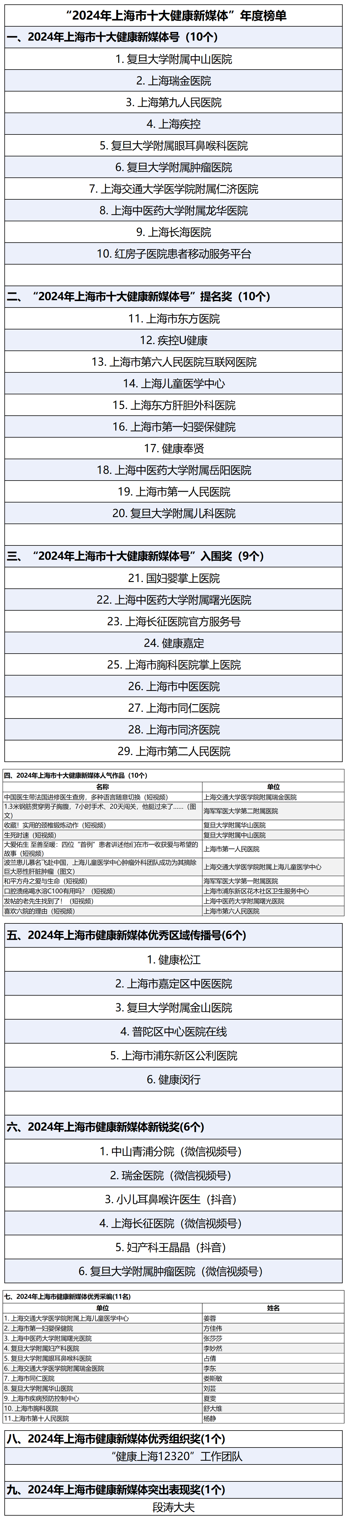 本次健康新媒体推选活动,涵盖本市卫生健康系统各单位、科室、医务人员开设的新媒体平台账号(包括微信公众号、微信视频号、抖音等)、其他医学健康类自媒体;与本市卫生健康相关的图文类、短视频类新媒体作品;一线新媒体采编工作人员。经过网络投票和专家评审,综合对新媒体传播力、影响力等进行全面评估,最终推选出“2024年上海市十大健康新媒体号”(10个)、“2024年上海市十大健康新媒体号”提名奖(10个)、“2024年上海市十大健康新媒体号”入围奖(9个)、“2024年上海市十大健康新媒体人气作品”(10个)、“2024年上海市健康新媒体优秀区域传播号”(6个)、“2024年上海市健康新媒体新锐奖”(6个)、“2024年上海市健康新媒体优秀采编”(11名)、“2024年上海市健康新媒体优秀组织奖”(1个)、“2024年上海市健康新媒体突出表现奖”(1个)。具体名单见附件。