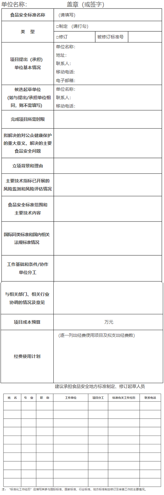 (一)标准项目承担单位应具备起草食品安全地方标准所需的技术能力和水平;能够组织开展食品安全地方标准制定、修订所需要的技术工作;在承担项目所涉及的领域内无利益冲突;能够提供食品安全地方标准制定、修订工作所需人员、经费、科研等方面的资源和保障条件;能够按照要求完成相关起草任务。鼓励相关单位联合提出立项建议。