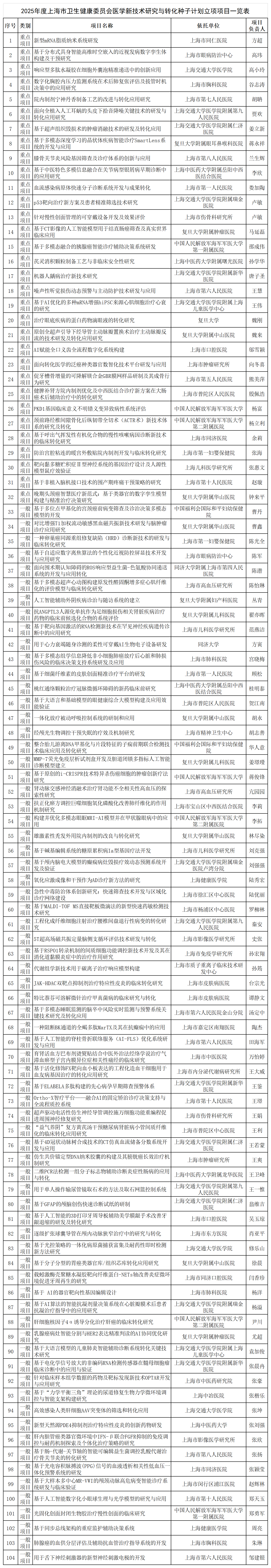 附件:2025年度上海市卫生健康委员会医学新技术研究与转化种子计划立项项目一览表