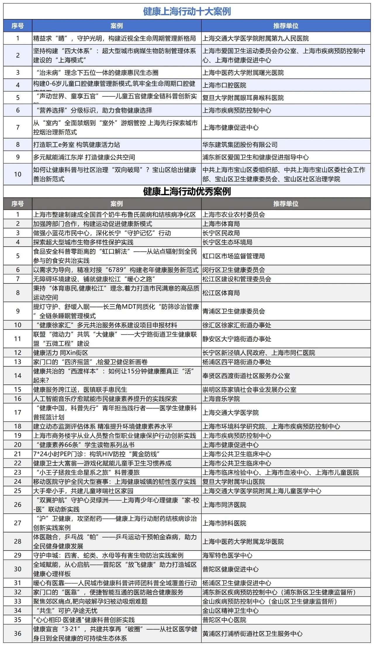经专家评审,评选出健康上海行动十大案例与36个优秀案例。现将名单予以公示,公示时间为自公示之日起5个工作日。公示期间,任何单位或个人如有异议,请向上海市爱国卫生运动委员会办公室据实反映,并提供必要的证明材料。以单位名义反映的须加盖单位公章,以个人名义反映的须署实名并提供联系方式。