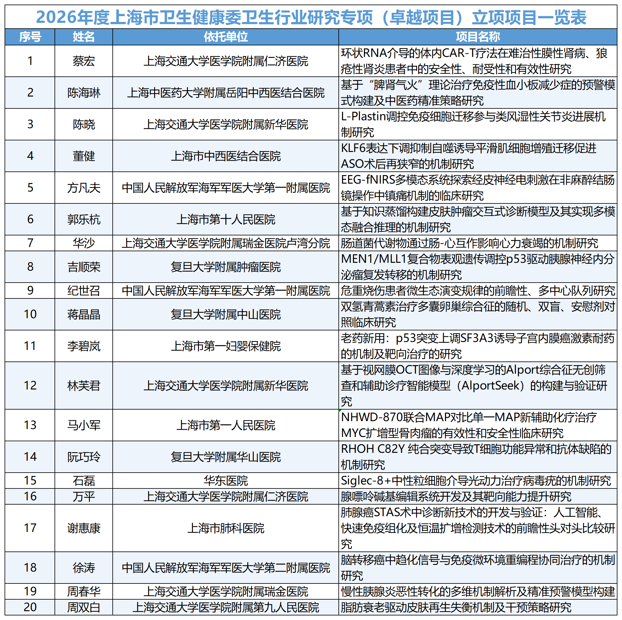 项目来了 | 上海市卫健委关于下达2026年度卫生行业研究专项(卓越项目)立项项目的通知