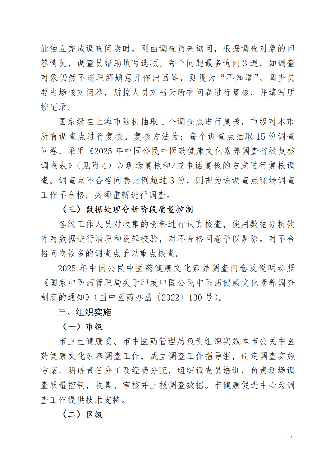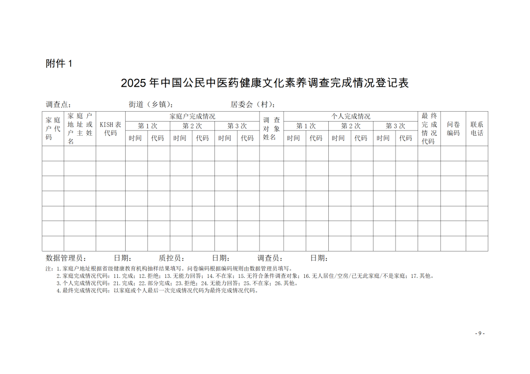 列入2025年中国公民中医药健康文化素养调查点的有关区卫生健康委要负责辖区内工作的统筹协调、组织实施和监督管理。要落实工作负责人及调查、质控等人员(见附件1),确保1名中医药专业人员参与入户调查,承担问卷解释工作。明确工作职责,严格按照实施方案的任务和考核要求开展调查,积极协调辖区街道(乡镇)、居(村)委会等相关部门,争取支持和配合,以确保各调查点调查工作程序规范、数据详实可靠,按期保质完成调查工作。