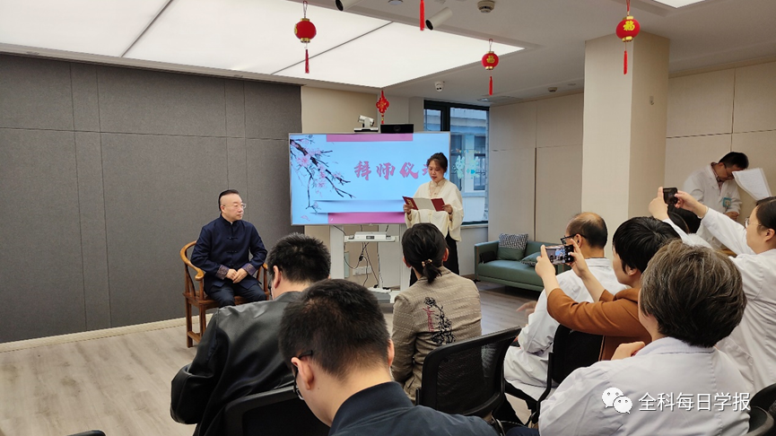 吴军豪主任致辞完毕,拜师仪式正式开始。仪式遵循古礼进行,庄严而肃穆。仪式开始,吴主任受邀登台入座,楚氏伤科第五代传人张玥琦当众宣读拜师帖,并登台向吴主任敬茶、献花。