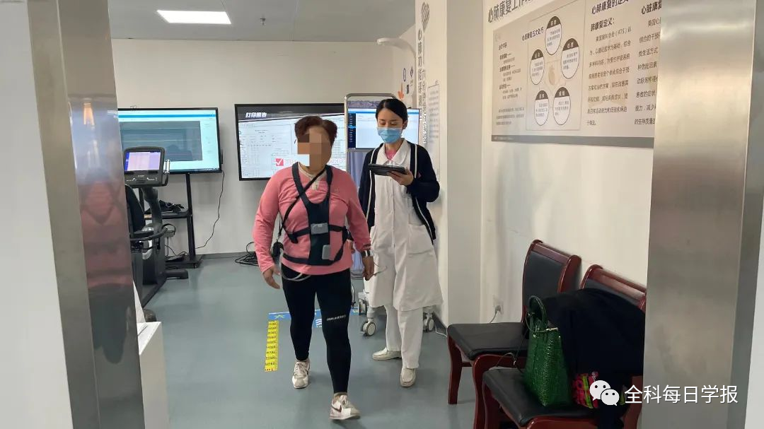 随后,护士陪伴姜阿姨来到心肺康复工作站,为她检测各项心肺指标,询问近期身体状况,在保证安全的前提下,才能进行康复训练。