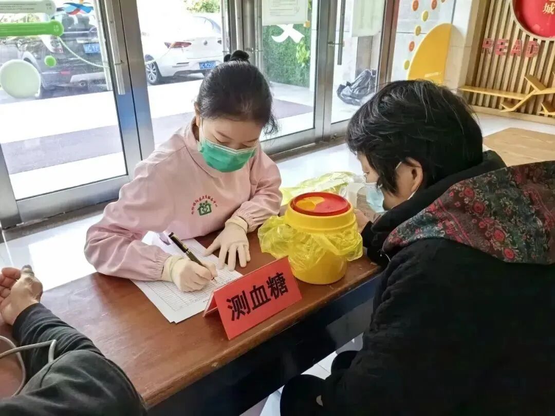 医务人员为社区居民开展量血压、测血糖、贴耳穴、中医咨询等项目,并向居民宣教冬季防病和养生知识。