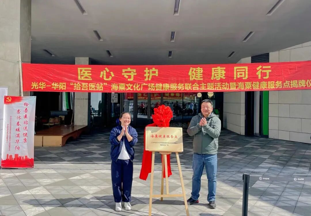 为持续推进学习贯彻习近平新时代中国特色社会主义思想的深化和转化工作,进一步学习贯彻党的二十届三中全会精神,华阳社区卫生服务中心党支部积极结合“一个支部一件实事”项目,不断提升“拾吾医站”和功能社区服务内涵,2024年11月6日中午,在海粟文化广场下沉式广场开展“医心守护•健康同行”——光华-华阳“拾吾医站”海粟文化广场健康服务联合主题活动暨海粟健康服务点揭牌仪式。