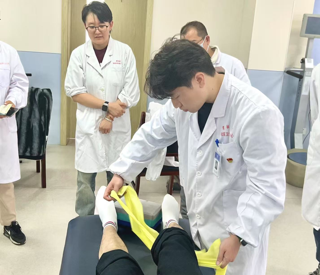 附图:社区运动医学能力提升项目中刘楷韵医生在华山医院运动医学科孙扬老师指导下进行操作