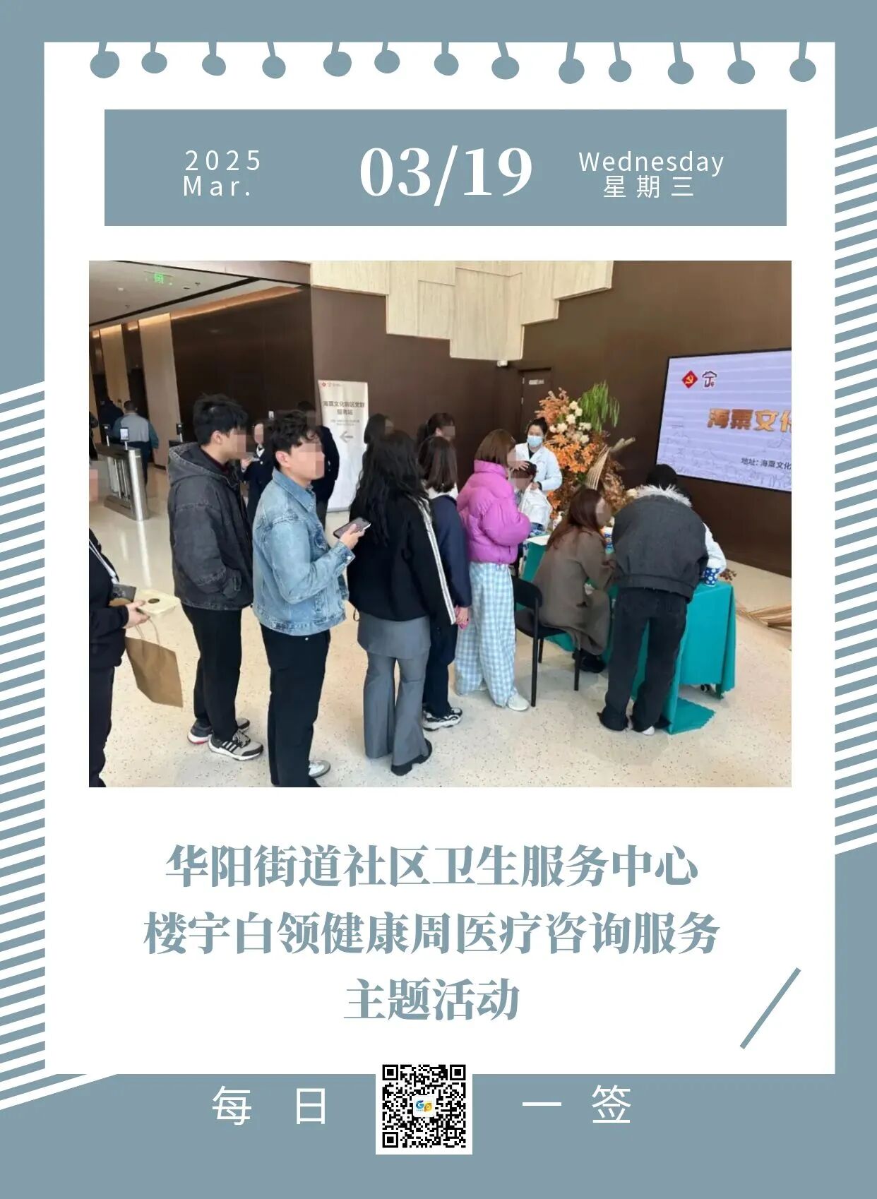 2025 年 3 月 18 日中午,华阳街道社区卫生服务中心在长宁区总工会、华阳街道总工会的支持下,在海粟文化广场 A 栋大堂为楼宇白领们举办了“楼宇白领健康周”医疗咨询服务主题活动。