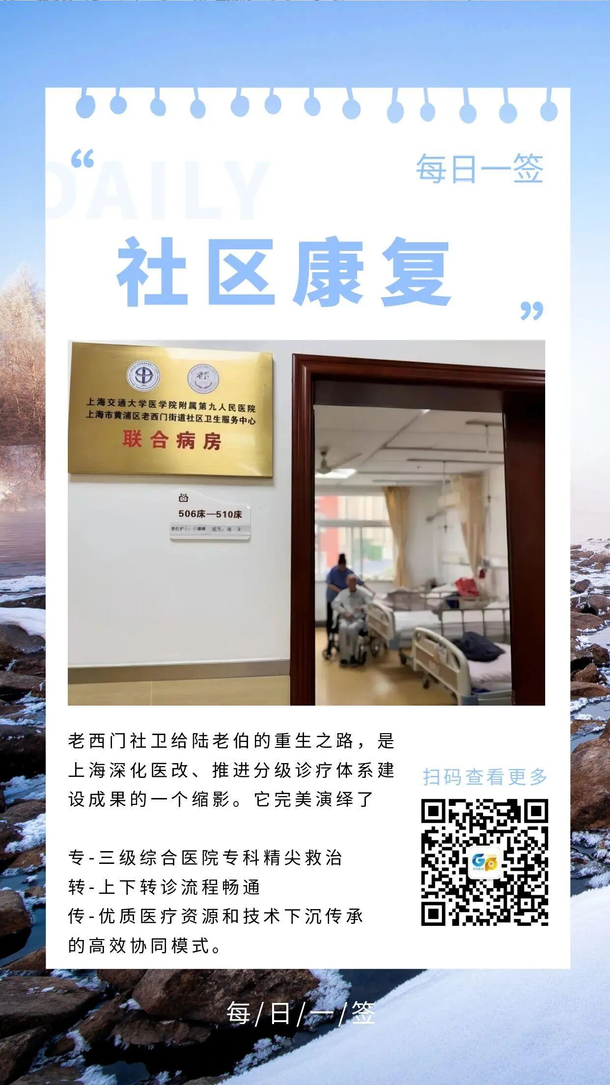 度过急性危险期后,系统、持续的康复治疗成为陆老伯恢复功能、重返生活的重中之重。遵循“急性期救治在三级医院,稳定期康复在社区”的科学分级诊疗原则,老西门街道社区卫生服务中心与九院进行了充分沟通和评估。在陆老伯病情稳定、符合转诊条件后,一场精心安排的“转”诊随即展开。两院医护团队详细交接病情、治疗方案和护理要点,确保信息传递无遗漏、患者转运安全平稳。陆老伯顺利“转”入老西门街道社区卫生服务中心病房,开启了康复新阶段。