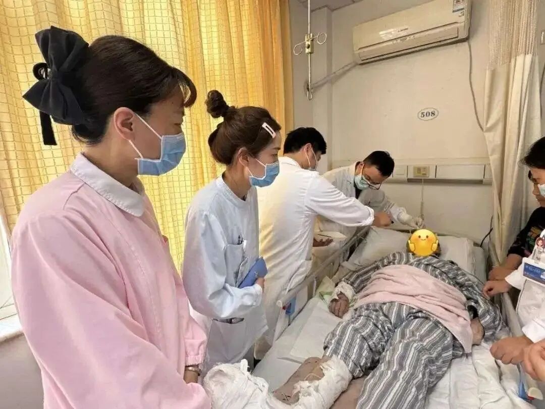 面对陆老伯复杂伤情带来的挑战,病房医护团队展现了精湛的技术和细致的服务:医生查房时条理清晰,治疗方案讲解通俗易懂,并始终保持关切态度;护士换药动作轻柔,耐心叮嘱康复注意事项。每日耐心、规范地为患者擦拭维护金属气切导管,有效预防了感染风险。在拆除石膏后,床位护士每日密切监测多处骨折伤口的愈合进展,通过细致的换药操作、严谨观察伤口渗液变化和肿胀消退情况、严格执行班班交接,确保了伤口护理质量。