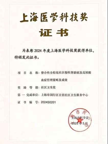 近日,2024年度上海医学科技奖颁奖大会在上海国际会议中心隆重举行。由中心作为第一完成单位申报的项目《整合性全程化社区慢性肾脏病及高尿酸血症管理策略及成效》,荣获2024年度上海医学科技奖(社区卫生奖)!