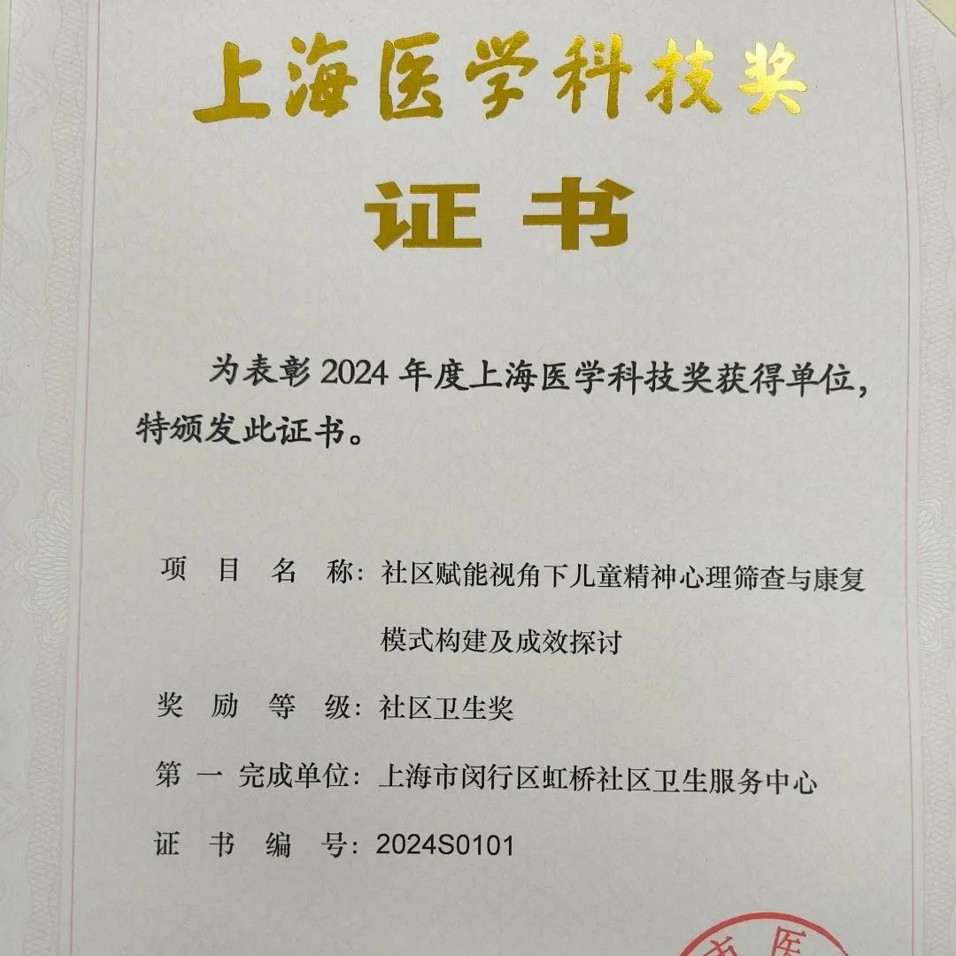 热烈祝贺,由闵行虹桥社区卫生服务中心作为第一完成单位申报的项目《社区赋能视角下儿童精神心理筛查与康复模式构建及成效探讨》,成功斩获2024年度上海医学科技奖——社区卫生奖!