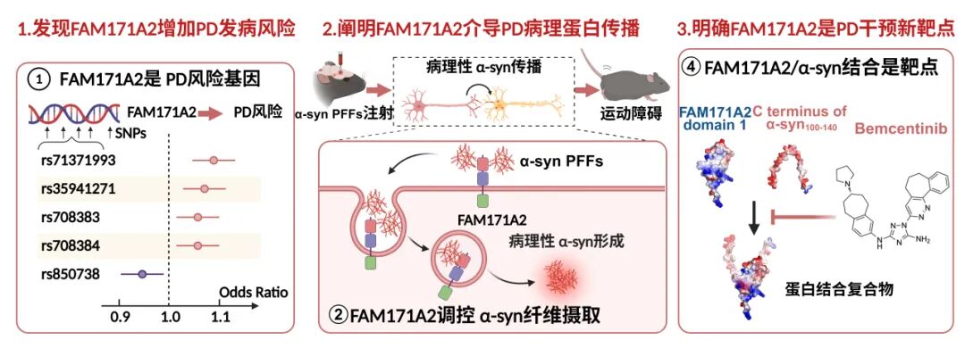 郁金泰团队结合临床数据和基础实验,发现了此前未知功能基因FAM171A2可作为这一关键受体。他们还精确鉴定了FAM171A2与病理性α-突触核蛋白相互作用的界面,并利用人工智能技术筛选到了能起到抑制作用的小分子。在体外和体内模型中,均可有效抑制毒性蛋白在神经元间的传播。这些发现表明,FAM171A2可能是首个阻断帕金森病进程的治疗靶点。
