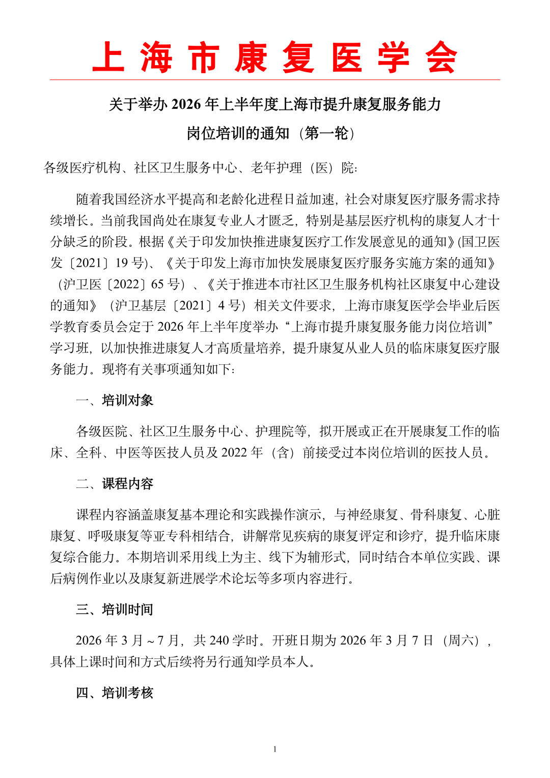 随着我国经济水平提高和老龄化进程日益加速,社会对康复医疗服务需求持续增长。当前我国尚处在康复专业人才匮乏,特别是基层医疗机构的康复人才十分缺乏的阶段。根据《关于印发加快推进康复医疗工作发展意见的通知》(国卫医发(2021〕19号)、《关于印发上海市加快发展康复医疗服务实施方案的通知》(沪卫医(2022〕65号)、《关于推进本市社区卫生服务机构社区康复中心建设的通知》(沪卫基层(2021〕4号)相关文件要求,上海市康复医学会毕业后医学教育委员会定于2026年上半年度举办“上海市提升康复服务能力岗位培训”学习班,以加快推进康复人才高质量培养,提升康复从业人员的临床康复医疗服务能力。现将有关事项通知如下: