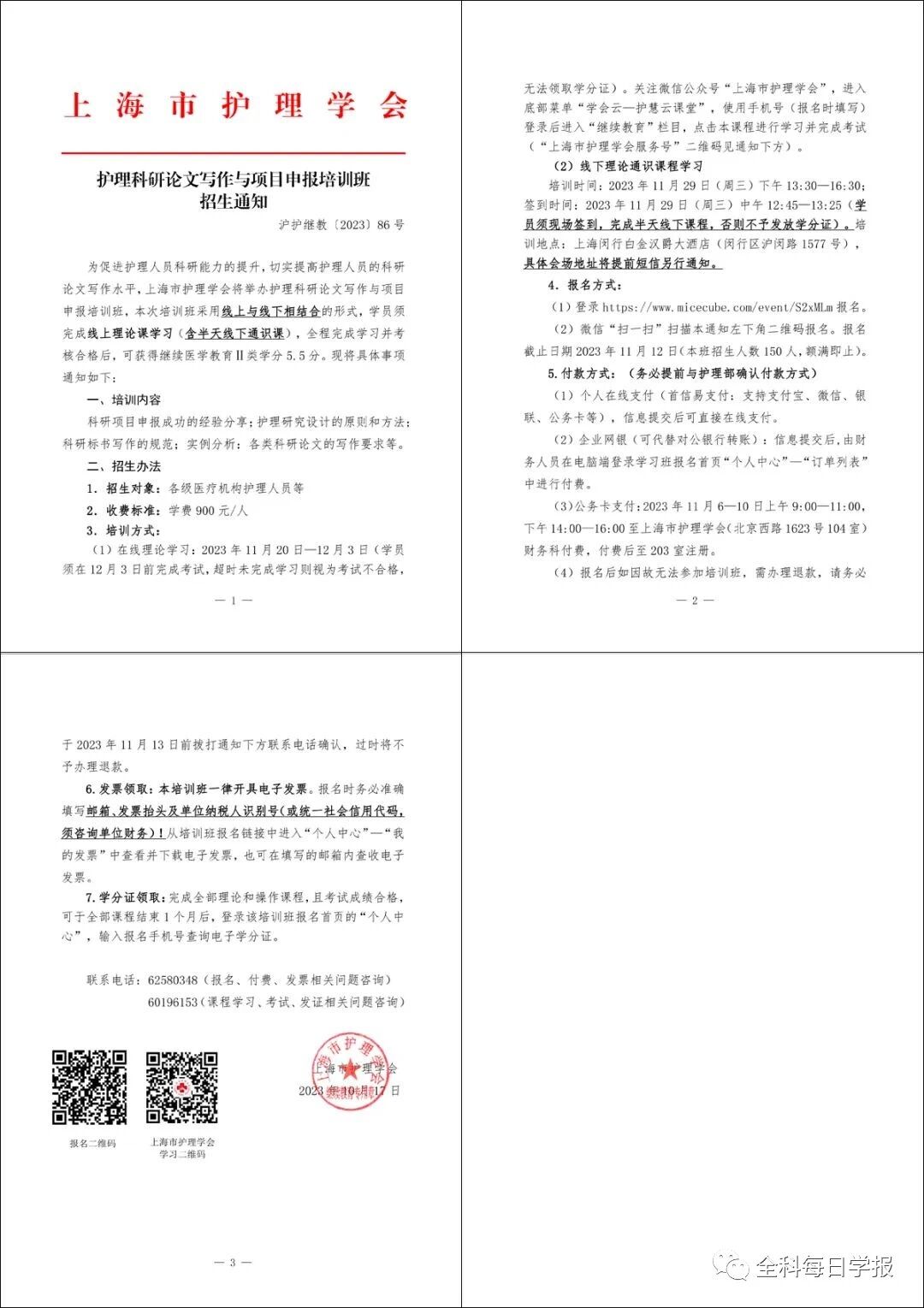 (1)在线理论学习:2023年11月20日—12月3日(学员须在12月3日前完成考试,超时未完成学习则视为考试不合格,无法领取学分证)。关注微信公众号“上海市护理学会”,进入底部菜单“学会云—护慧云课堂”,使用手机号(报名时填写)登录后进入“继续教育”栏目,点击本课程进行学习并完成考试(“上海市护理学会服务号”二维码见通知下方)。