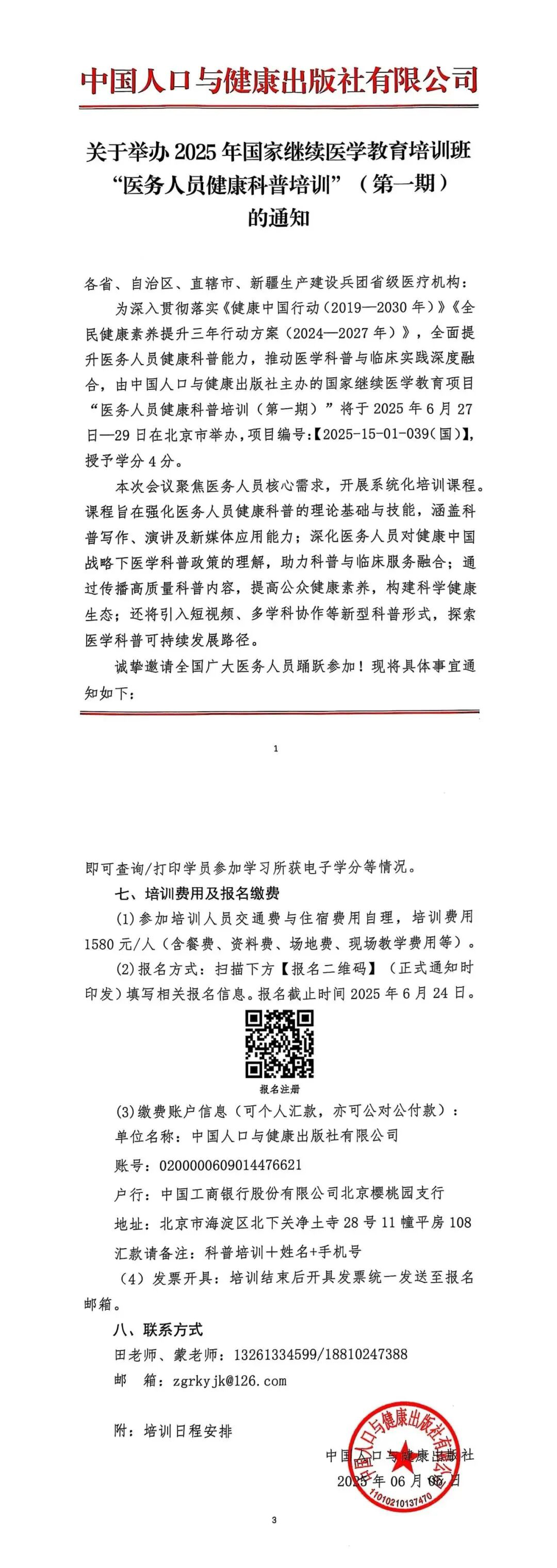 为深入贯彻落实《健康中国行动(2019—2030年)》《全民健康素养提升三年行动方案(2024—2027年)》,全面提升医务人员健康科普能力,推动医学科普与临床实践深度融合,由中国人口与健康出版社主办的国家继续医学教育项目“医务人员健康科普培训(第一期)”将于2025年6月27日—29日在北京市举办,项目编号:【2025-15-01-039(国)】,授予学分4分。