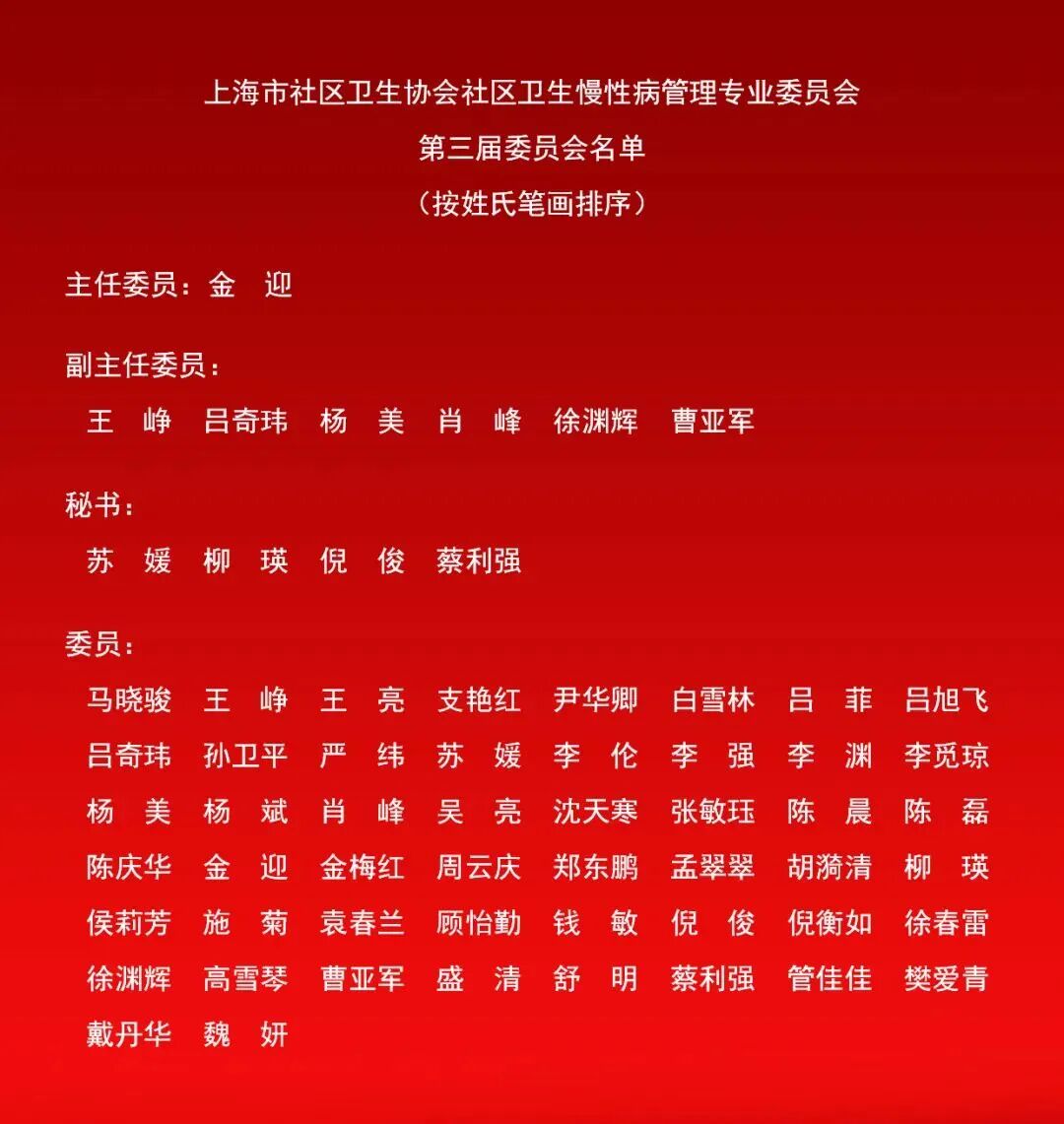 根据《上海市社区卫生协会分支机构管理规定》要求,由慢病专委会第三届委员会全体委员无记名投票选举主委、副主委。应到委员50人,实到37人,委托10人,符合规定。委员们全票通过新一届专委会主任委员、副主任委员候选人(第三届委员会委员名单后附)。