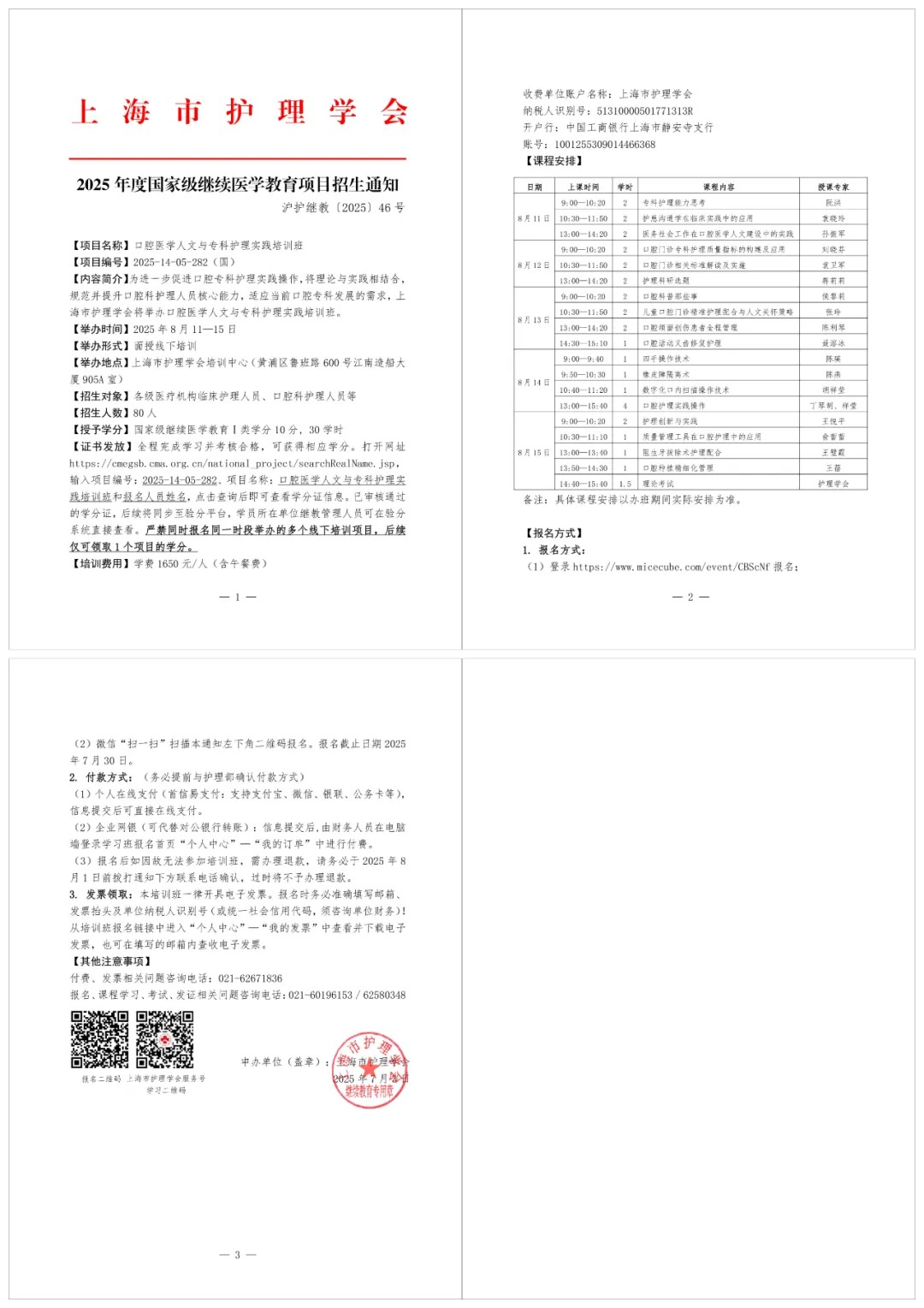 学费1650元/人(含午餐费)收费单位账户名称:上海市护理学会纳税人识别号:51310000501771313R开户行:中国工商银行上海市静安寺支行账号:1001255309014466368