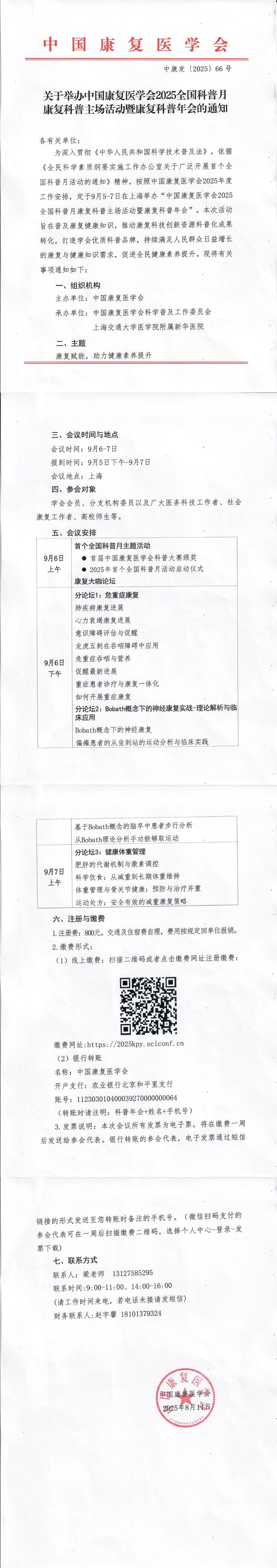 为深入贯彻《中华人民共和国科学技术普及法》,依据《全民科学素质纲要实施工作办公室关于广泛开展首个全国科普月活动的通知》精神,按照中国康复医学会2025年度工作安排,定于9月5-7日在上海举办“中国康复医学会2025全国科普月康复科普主场活动暨康复科普年会”。本次活动旨在普及康复健康知识,推动康复科技创新资源科普化成果转化,打造学会优质科普品牌,持续满足人民群众日益增长的康复与健康知识需求,促进全民健康素养提升。现将有关事项通知如下: