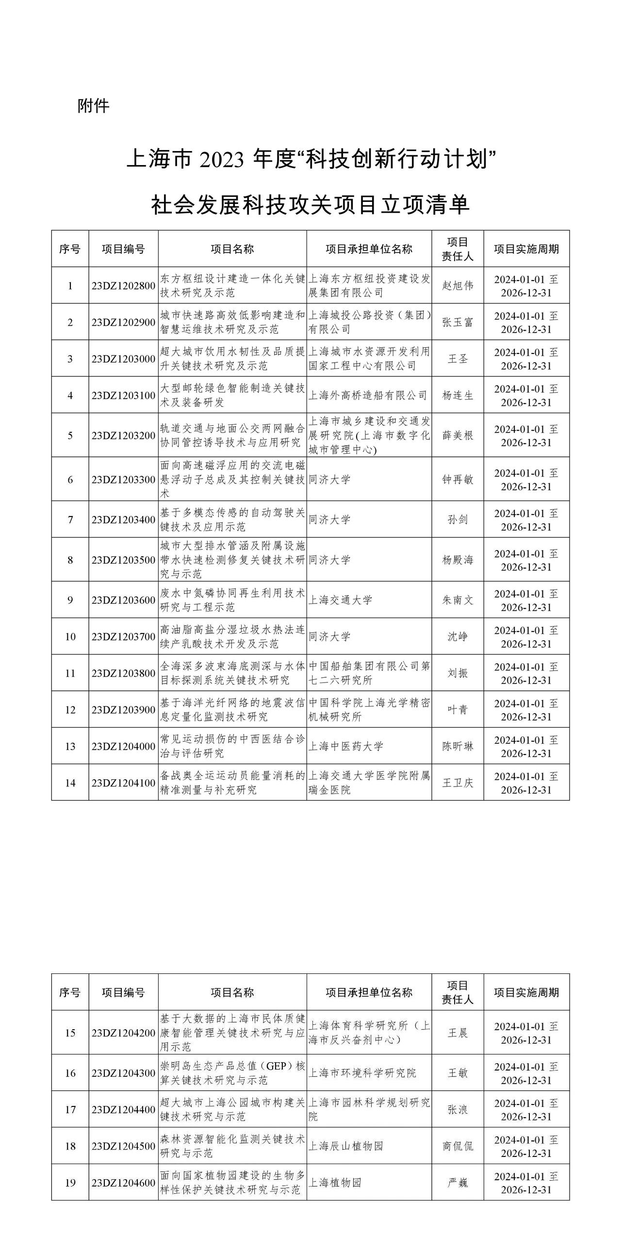根据《关于发布上海市2023年度“科技创新行动计划”社会发展科技攻关项目申报指南的通知》(沪科指南〔2023〕22号)要求,经公开申报、形式审查、专家评审、立项公示等程序,现对《东方枢纽设计建造一体化关键技术研究及示范》等19个项目予以立项,市科委资助8265.30万元,其中2023年拨款7438.77万元;《常见运动损伤的中西医结合诊治与评估研究》等3个竞技体育与全民健身支撑技术方向项目,上海市体育局配套资助300万元,其中2023年拨款240万元。请各项目承担单位做好项目组织实施和管理工作,确保按期完成项目研究任务目标。
