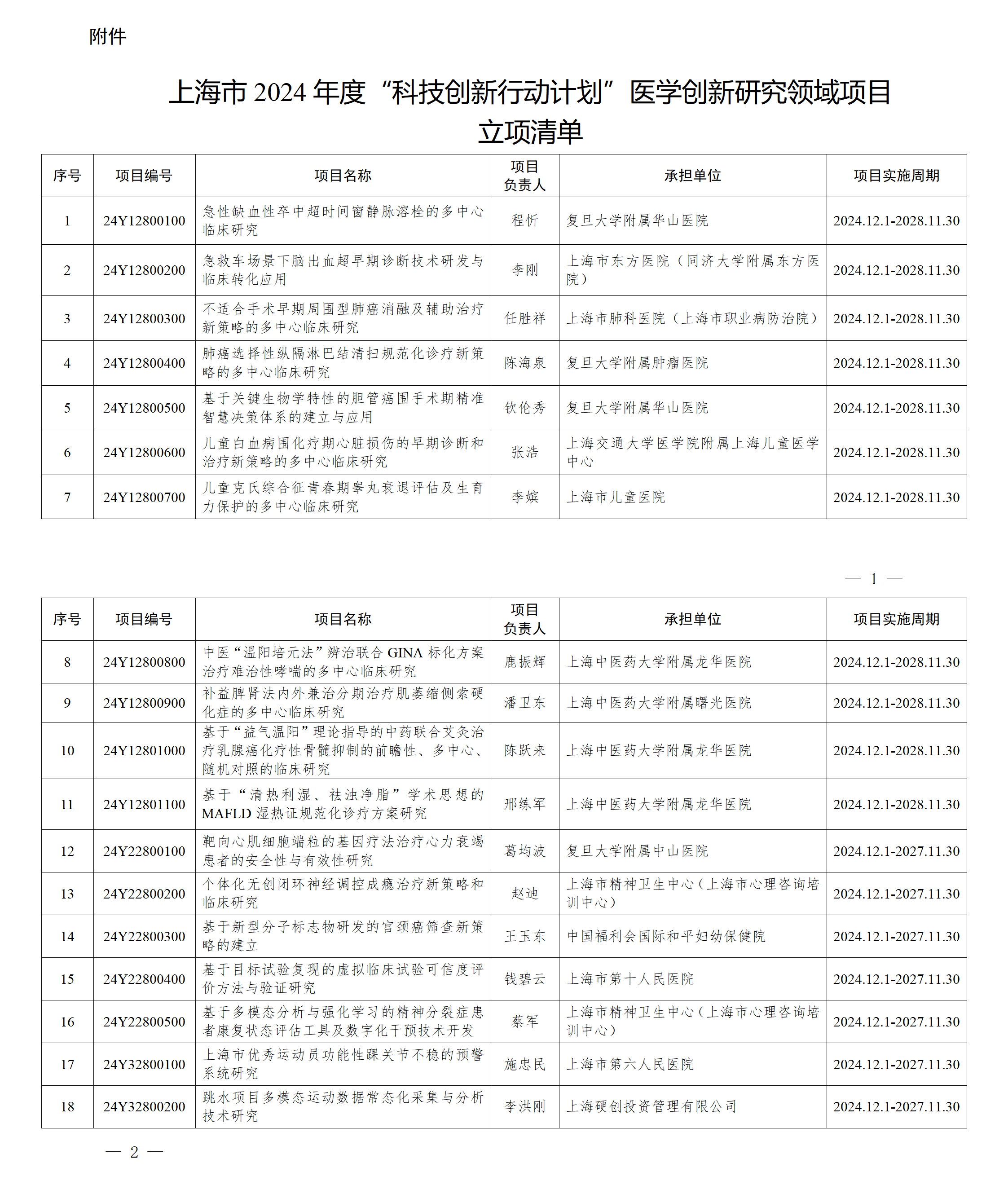 附件:上海市2024年度“科技创新行动计划”医学创新研究领域项目立项清单