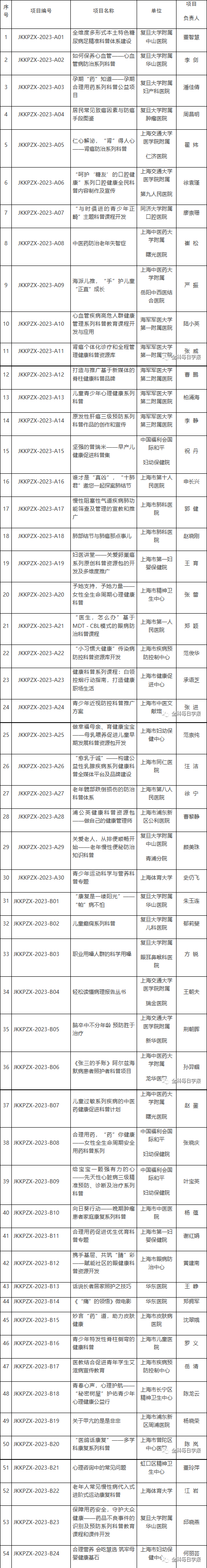为贯彻落实《关于健全全媒体健康科普知识发布和传播机制 增加健康科普优质资源供给的实施意见》(沪卫健康〔2023〕2号),加强本市健康科普能力建设,普及健康生活方式,提升市民健康素养,持续为上海市健康科普资源库建设提供内容支持,上海市卫生健康委员会、上海市健康促进委员会办公室于2023年6月启动了“2023年度上海市健康科普专项计划”(以下简称“科普专项”)申报工作。经多轮筛选和现场答辩复审,“科普专项”共遴选推出54个立项项目(名单见附件),其中30个项目有财政经费支持(每个项目资助10万元),24个项目经费自筹。请各立项项目单位和项目负责人严格按照项目任务书的内容要求,落实相关经费保障,认真做好项目的推进实施,确保专项按时、高质量完成。联系人:束老师,电话:34198171,电子邮箱:jiankangchu@wsjkw.sh.gov.cn。