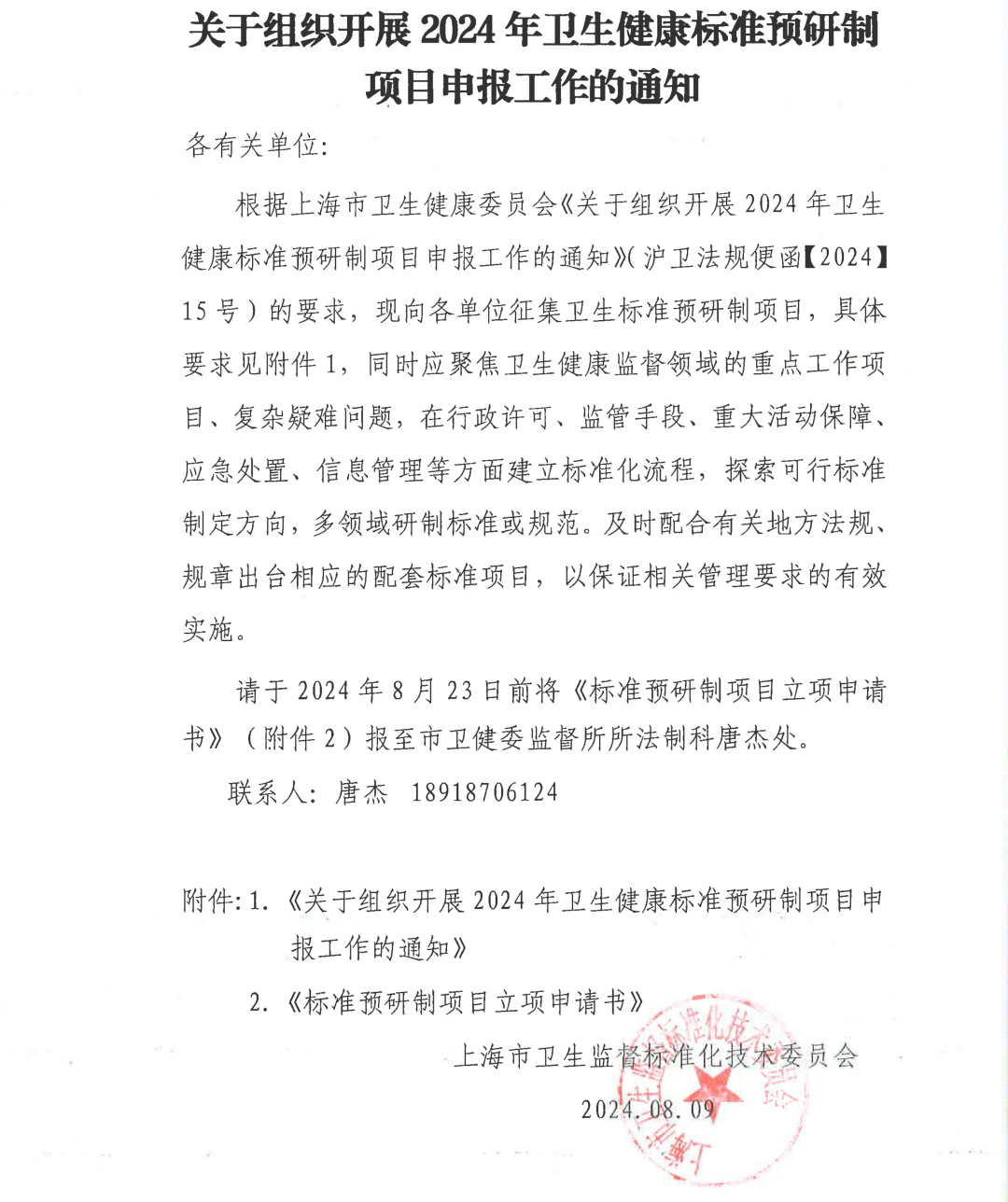 1.2024年卫生健康标准预研制项目申报工作的通知