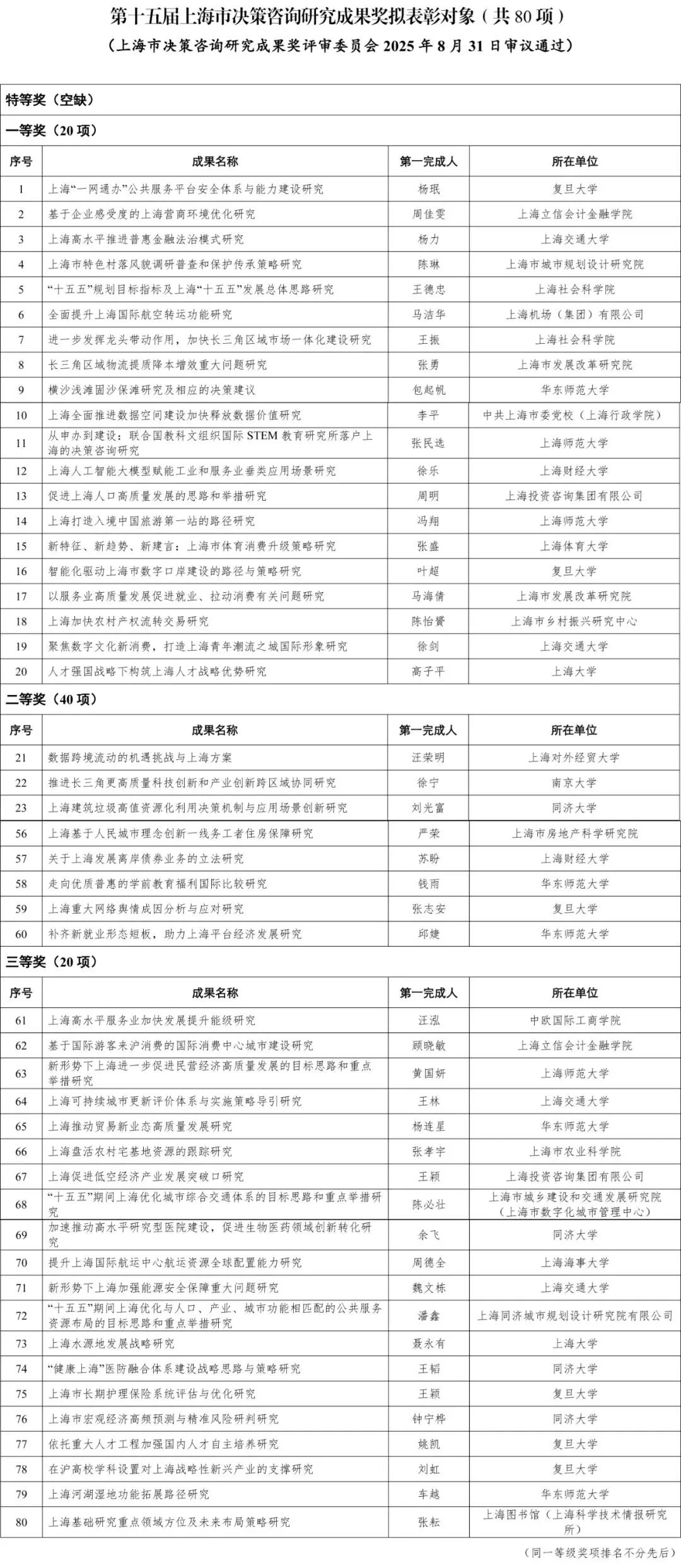 为进一步调动广大研究机构和人员积极性,发挥优秀成果示范引领作用,推动上海决策咨询事业繁荣发展,助力上海加快建成具有世界影响力的社会主义现代化国际大都市,根据《上海市决策咨询研究成果奖励规定》,市政府组织开展了第十五届上海市决策咨询研究成果奖评选工作。经严格评选程序,《上海“一网通办”公共服务平台安全体系与能力建设研究》等80项成果拟获第十五届上海市决策咨询研究成果奖。