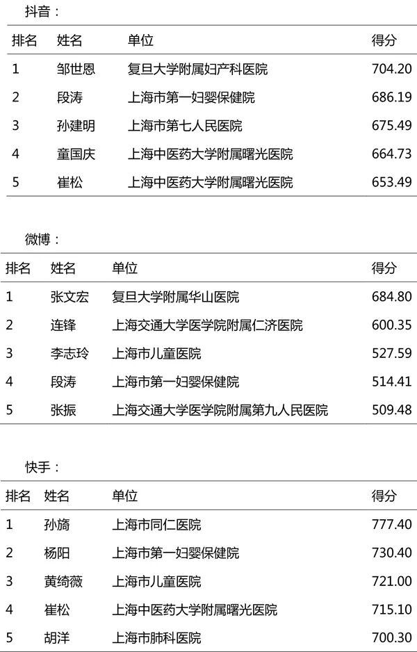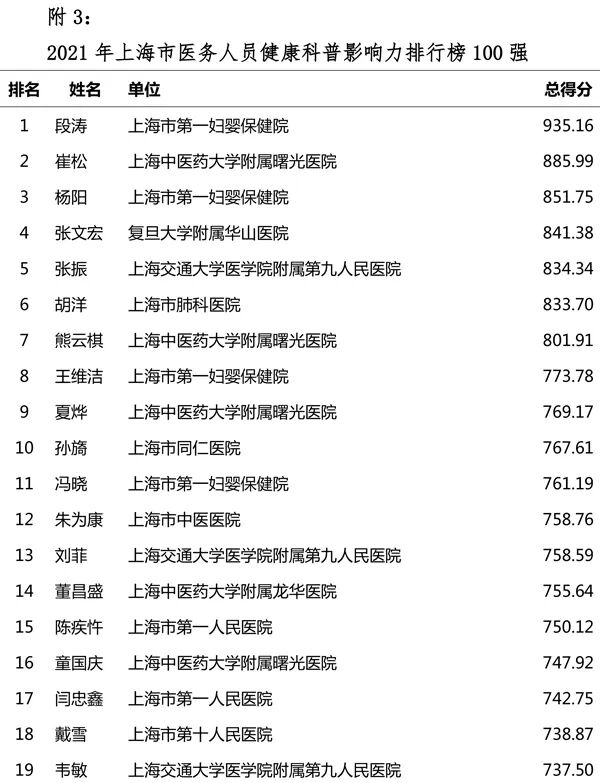 复旦大学附属中山医院、上海交通大学医学院附属仁济医院、上海市第一妇婴保健院等入选医疗机构健康科普影响力指数排行榜50强;黄浦区打浦桥街道社区卫生服务中心、松江区泗泾镇社区卫生服务中心、奉贤区南桥镇社区卫生服务中心等入选社区卫生服务中心健康科普影响力指数排行榜50强;段涛、崔松、杨阳等入选医务人员健康科普影响力指数排行榜100强。