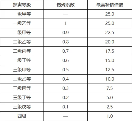 一级乙等至三级戊等对应的伤残系数为1至0.1(见附件)。