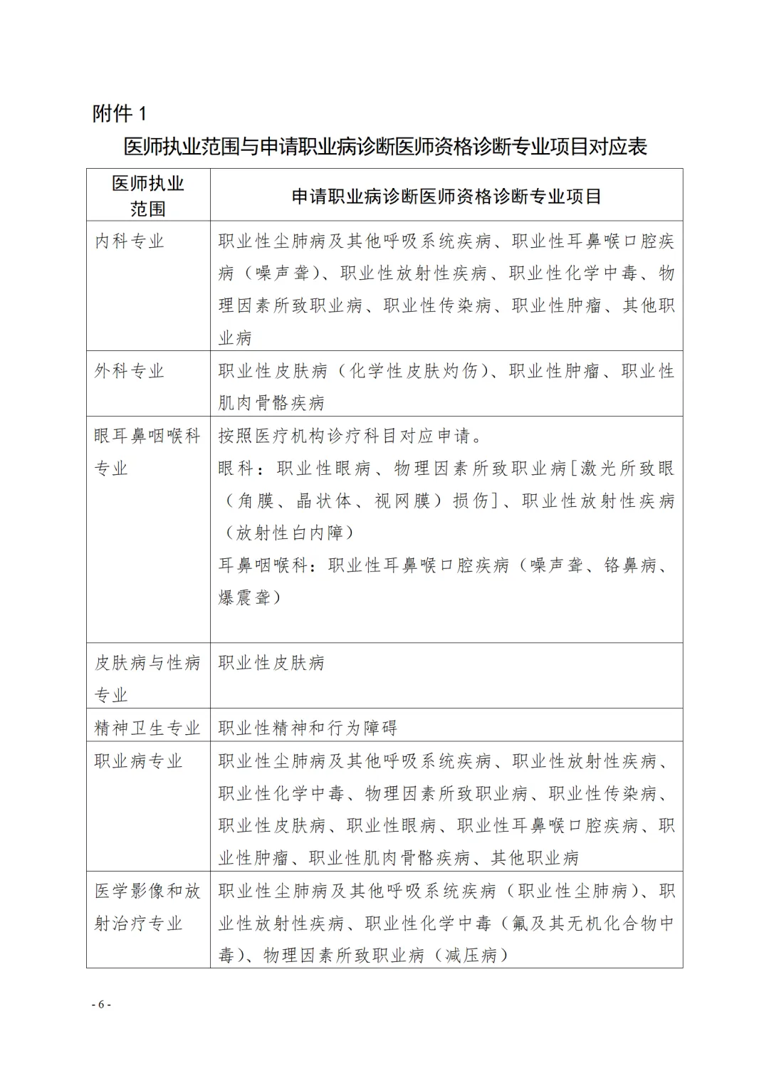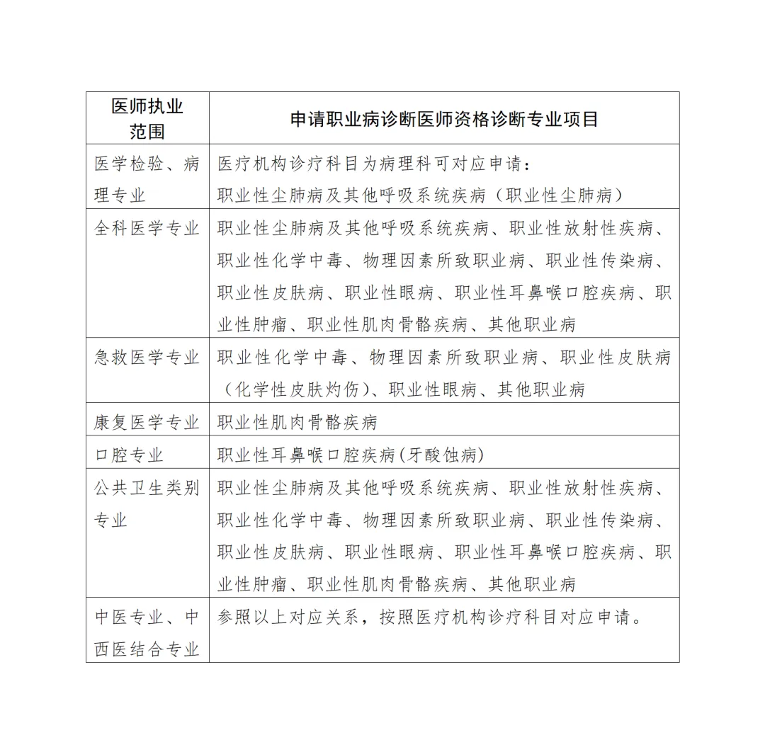 根据《职业病分类与目录》,职业病诊断专业项目类别扩大为12个类别,并调整了附件1《医师执业范围与申请职业病诊断医师资格诊断专业项目对应表》和附件2《上海市职业病诊断医师资格申请表》。