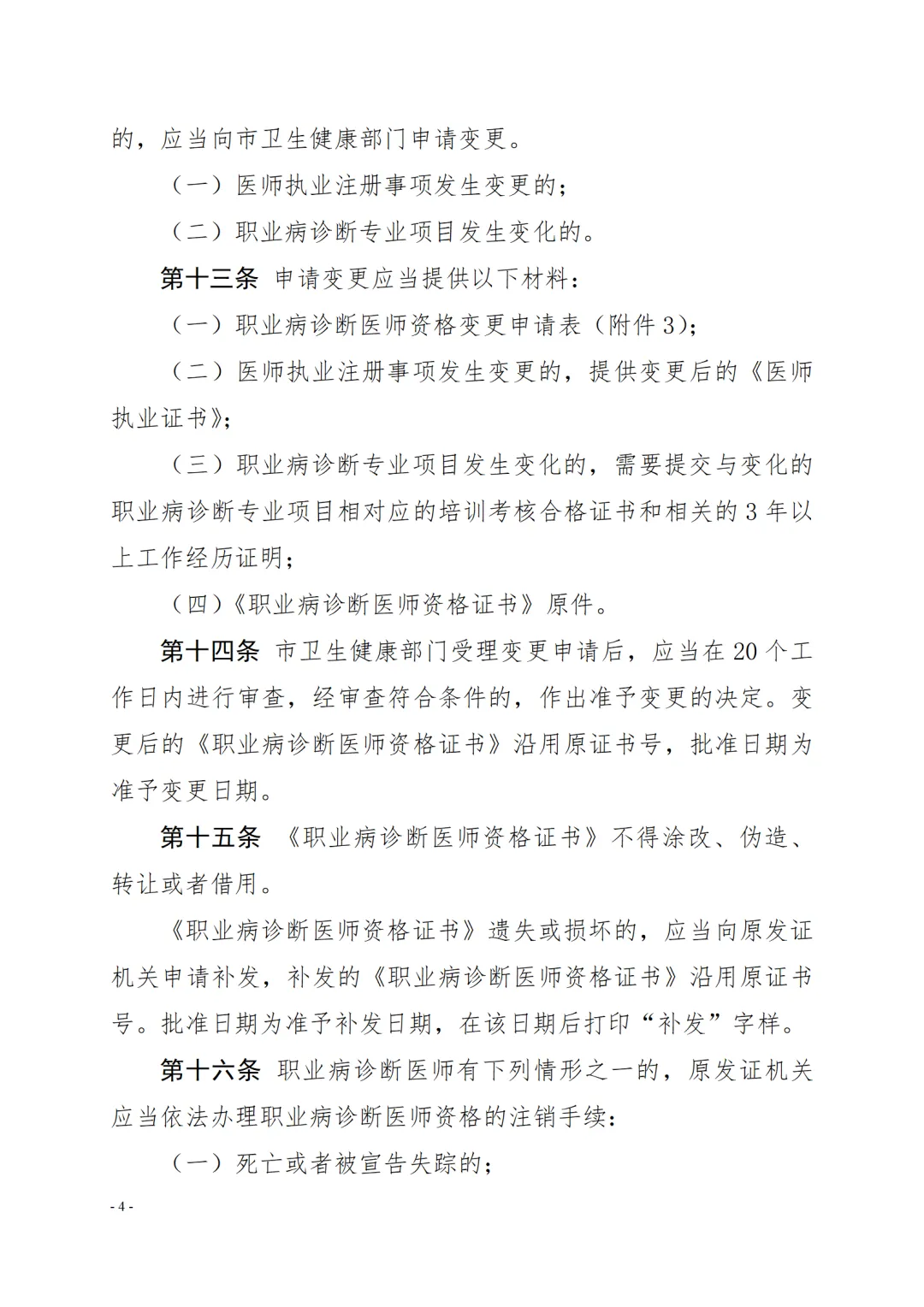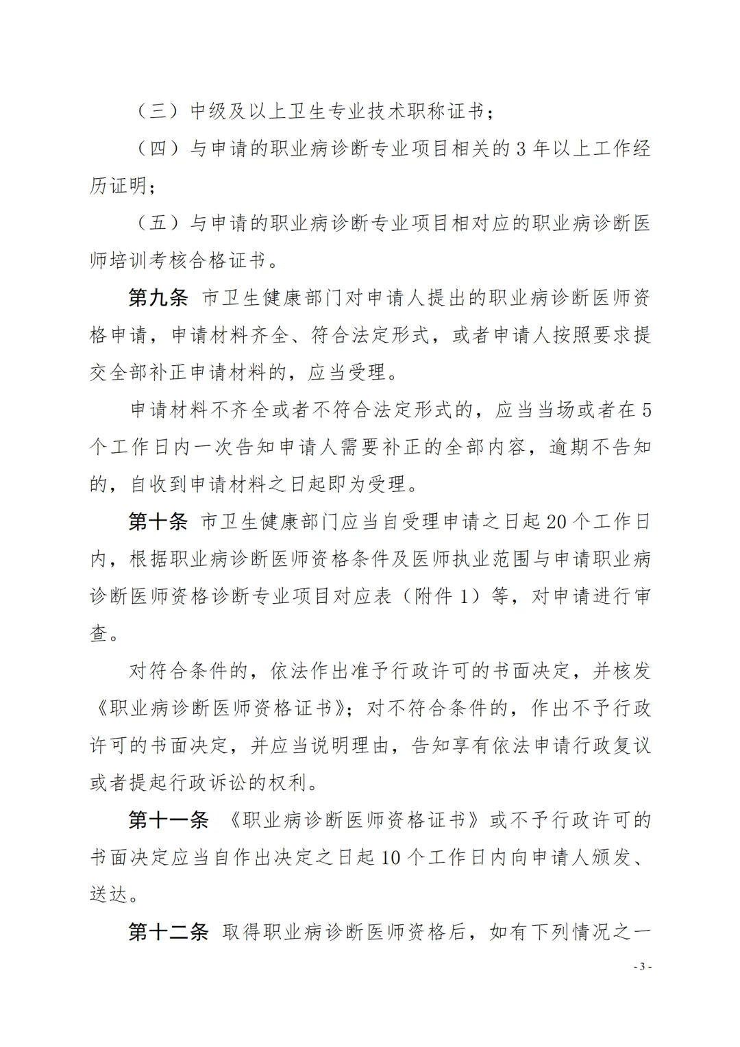 规定本市职业病诊断医师的培训考核机制。“市卫生健康部门负责组织实施职业病诊断医师资格培训考核工作。培训工作依据国家卫生健康委制定的职业病诊断医师培训大纲进行,培训考核合格的颁发职业病诊断医师培训考核合格证书,培训考核合格证书有效期3年。”