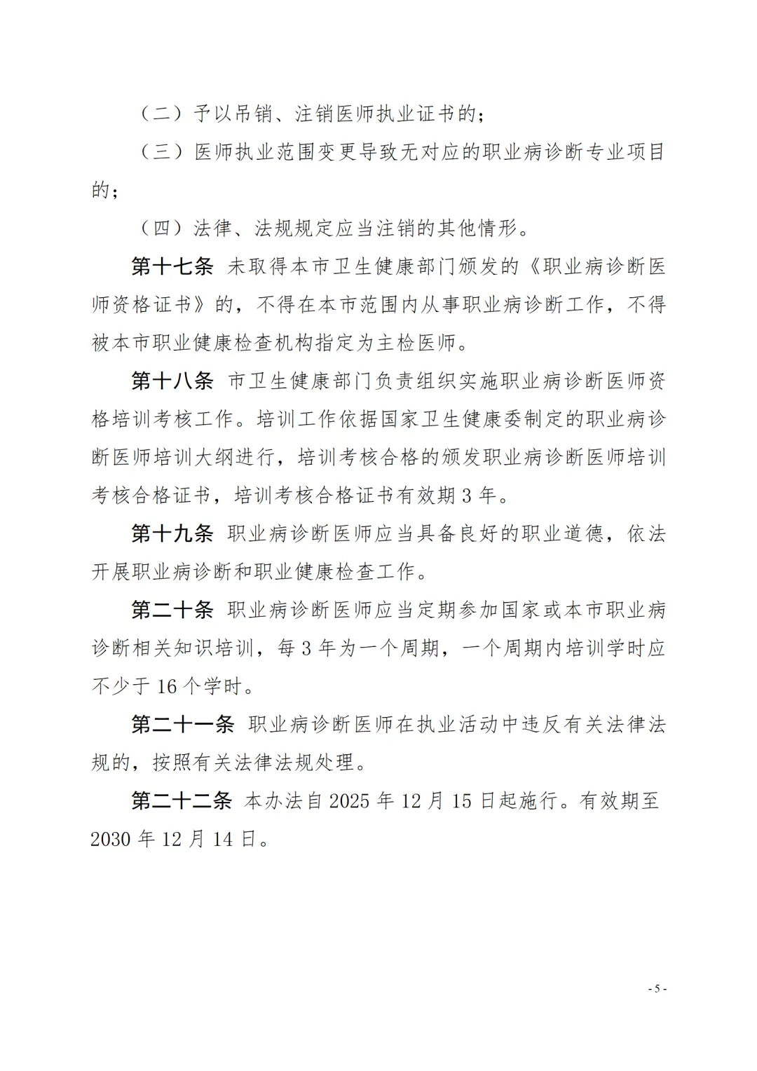 为了加强本市职业病诊断医师队伍建设,规范职业病诊断医师管理工作,提高职业病诊断医师职业道德和专业技术素养,保障职业病诊断医师的合法权益,依据《中华人民共和国职业病防治法》《中华人民共和国医师法》《职业病诊断与鉴定管理办法》《职业健康检查管理办法》《职业病分类和目录》等法律法规和相关规定,我委组织制定了《上海市职业病诊断医师管理办法》,经2025年10月30日市卫生健康委第82次委务会审议通过,现印发给你们,请遵照执行。本办法自2025年12月15日起施行,有效期至2030年12月14日止。