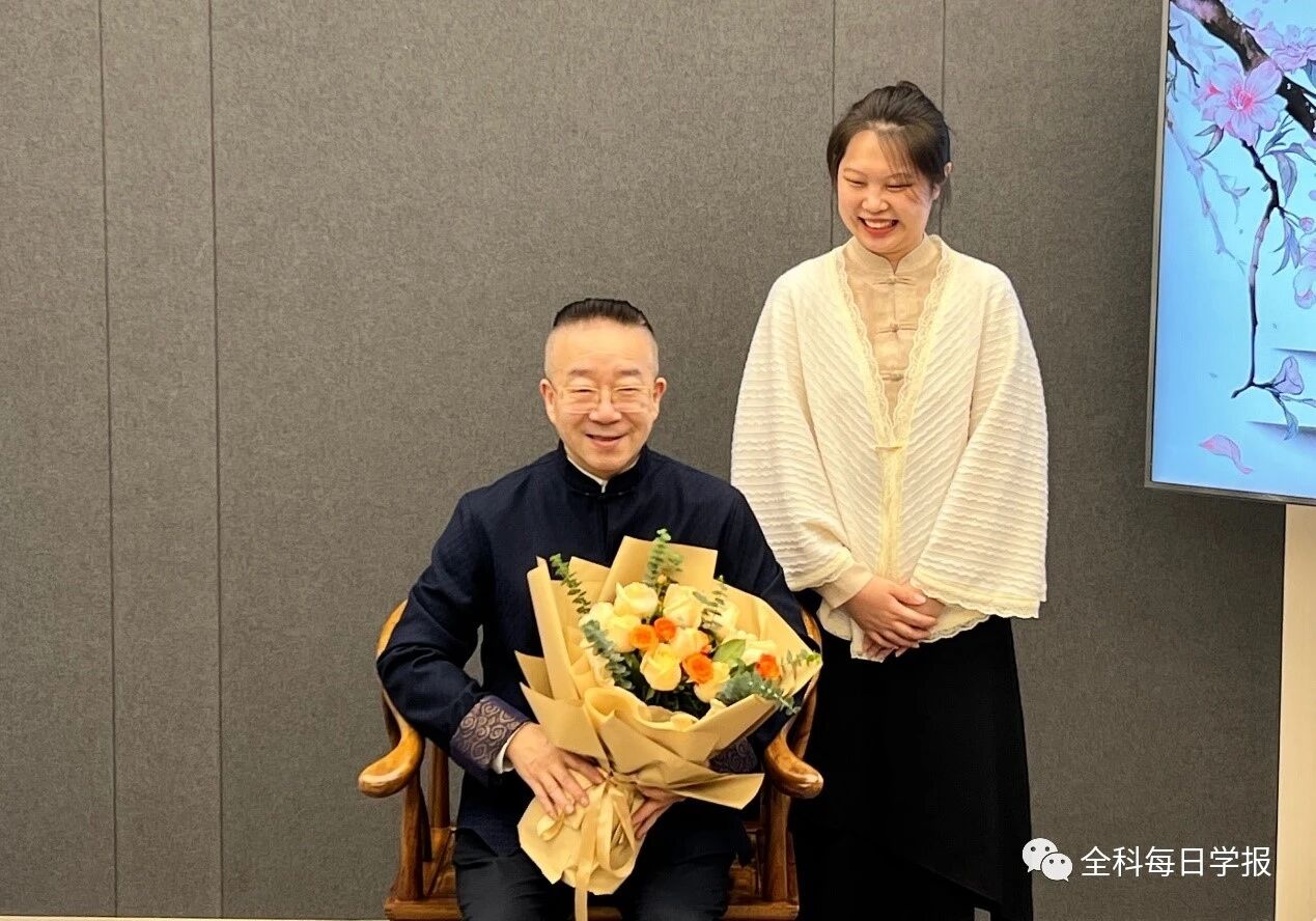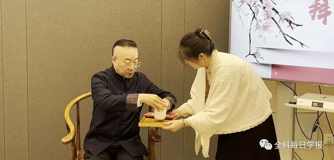 吴军豪主任致辞完毕,拜师仪式正式开始。仪式遵循古礼进行,庄严而肃穆。仪式开始,吴主任受邀登台入座,楚氏伤科第五代传人张玥琦当众宣读拜师帖,并登台向吴主任敬茶、献花。