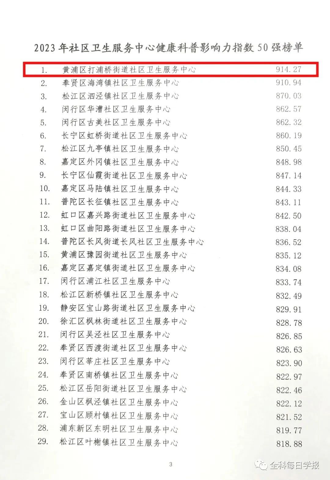 今年,上海共有173家医疗机构(包括167家公立医院、6家社会办医机构)、248家社区卫生服务中心参与本次健康科普影响力评价,各级医疗卫生机构推荐472名医务人员参与本次评价。打浦桥社区卫生服务中心在248家社区卫生服务中心中脱颖而出,继去年获得排行榜第一之后,今年再次位居榜首,蝉联第一!