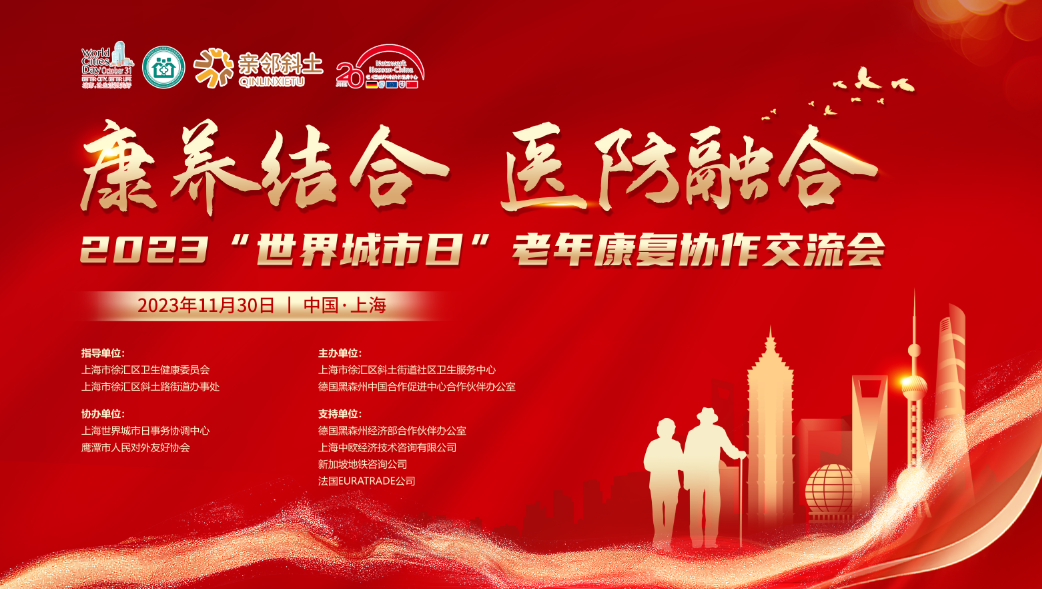 11月30日,康养结合、医防融合——中国上海2023“世界城市日”老年康复协作交流会在徐汇滨江党群服务中心顺利召开。交流会由徐汇区卫生健康委员会、徐汇区斜土路街道办事处指导,上海市徐汇区斜土街道社区卫生服务中心、德国黑森州中国合作促进中心合作伙伴办公室主办,上海世界城市日事务协调中心、鹰潭市人民对外友好协会协办,德国黑森州经济部合作伙伴办公室、上海中欧经济技术咨询有限公司、新加坡地铁咨询公司、法国EURATRADE公司支持。