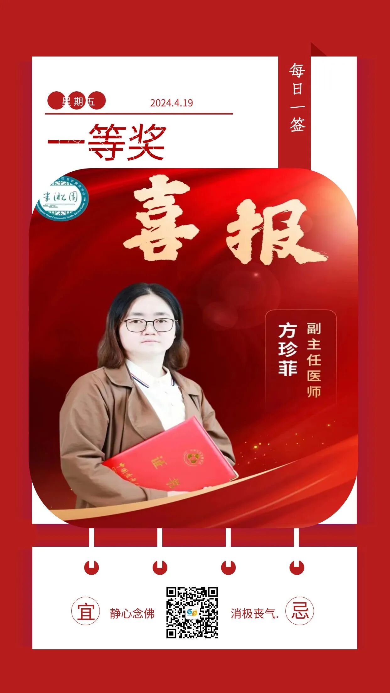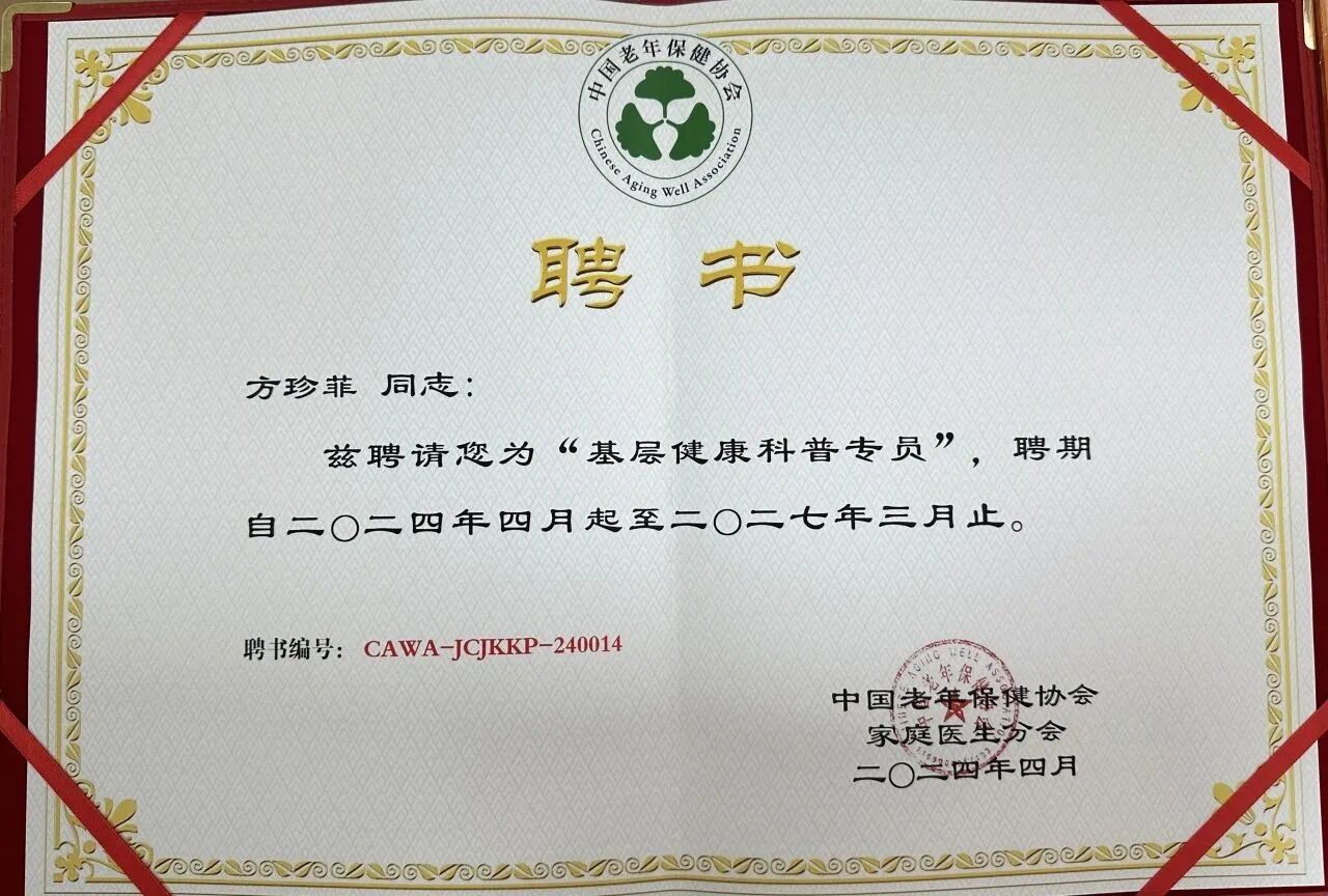 会上,中心副主任医师方珍菲被聘为中国老年保健协会“基层健康科普专员”。并且,荣获基层健康科普大赛图文类一等奖!