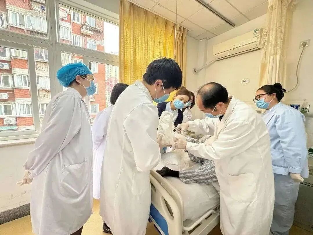 面对陆老伯复杂伤情带来的挑战,病房医护团队展现了精湛的技术和细致的服务:医生查房时条理清晰,治疗方案讲解通俗易懂,并始终保持关切态度;护士换药动作轻柔,耐心叮嘱康复注意事项。每日耐心、规范地为患者擦拭维护金属气切导管,有效预防了感染风险。在拆除石膏后,床位护士每日密切监测多处骨折伤口的愈合进展,通过细致的换药操作、严谨观察伤口渗液变化和肿胀消退情况、严格执行班班交接,确保了伤口护理质量。