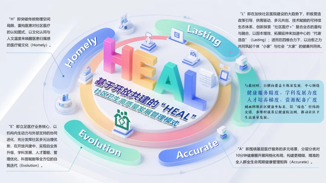 为进一步提升社区医疗机构质量管理水平,加快发挥科学管理模式对提升基层服务能力的战略效能,中心基于“六宝三圈三力”(633)模式,创新构建开放共建自进化式社区卫生服务体系的新型建设路径与质量管理体系以及以全人群全生命周期健康为中心的HEAL(Homely归属、Evolution进化、Accurate精准、Lasting持续)社区卫生高质量发展管理模式,在管理科学与人本主义的范式融合下,围绕医疗、人文、数智、科普、人才、生态六个维度充分发挥领导力价值创造,建立“四纬六维”的领导力体系,在医患的“双向奔赴”下,切实架设起联结领域创新与健康促进的平衡之桥。此次,这一模式荣获第五届黄浦区区长质量奖入围奖先进质量管理模式。